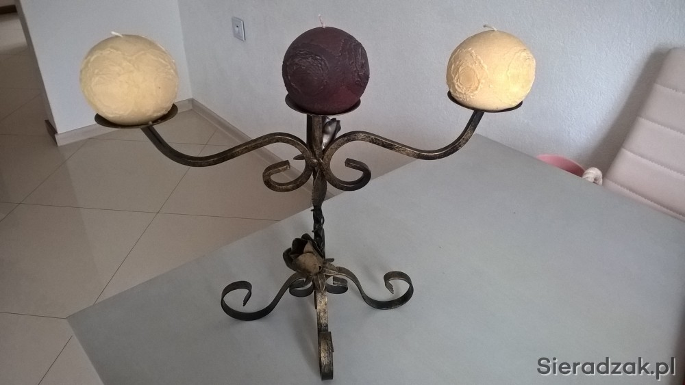 Sprzedam metalowy świecznik trójramienny, w kolorze starego złota. Wysokość bez świeczek: 30 cm. Szerokość 40 cm.