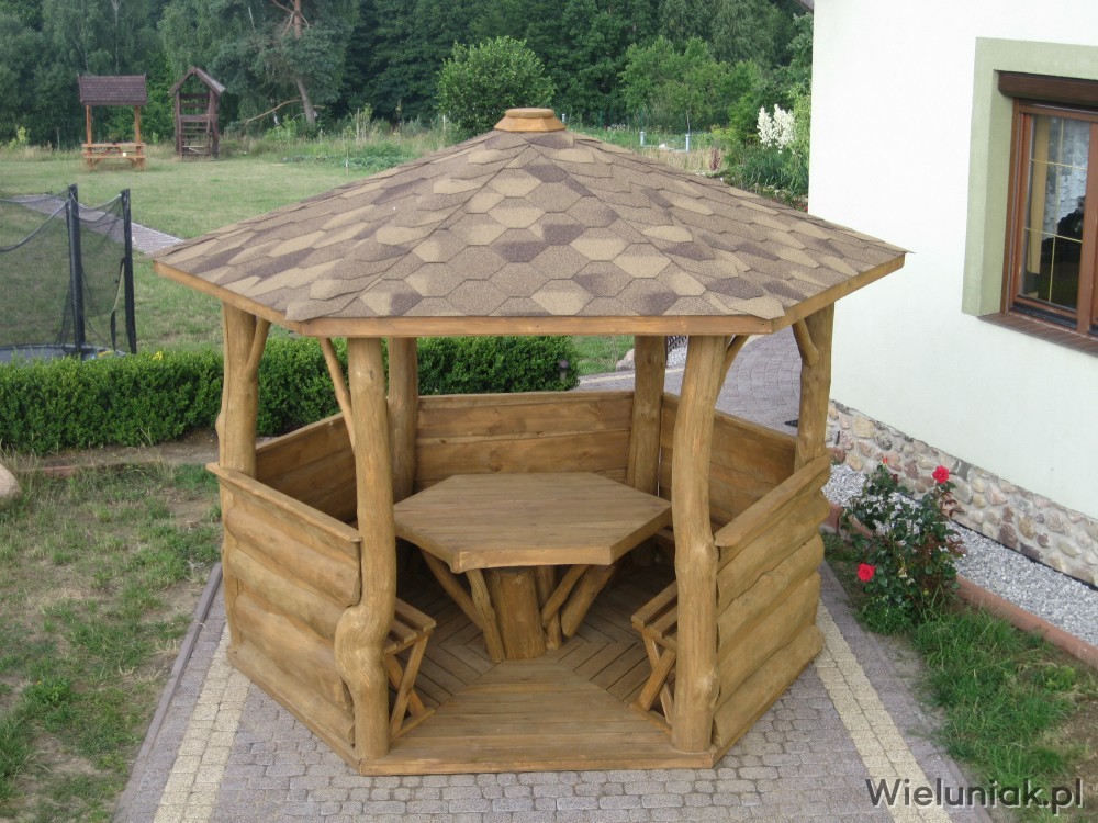 1. Słupy altany wykonane z bali z naturalną krzywizną średnicy ok. 12 cm, wys. całkowita do 270 cm,