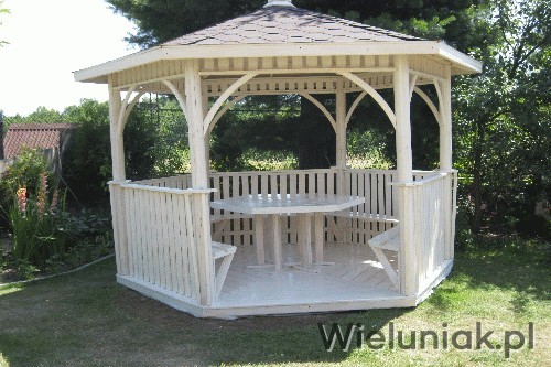 Altany ogrodowe wykonywane są z drewna sosnowego. Każda altana drewniana jest ustawiana na odpowiednio rozmieszczonych i wypoziomowanych podkładach betonowych, które zabezpieczają przed gromadzeniem się wody pod podłogą altany i zapewniają cyrkulację powietrza pod podłogą. Stosujemy również agrowłókninę, której zadaniem jest zapobieganie przerastaniu roślinności między deskami podłogowymi. Słupy altany mają wysokość 200 cm, natomiast całkowita wysokość altany wynosi 270 cm. Dachy altan wykonane są z desek boazeryjnych oraz pokryte gontem bitumicznym co zapewnia długoletnią trwałość każdej altany oraz odpowiednie wrażenia estetyczne. Każda z altan wyposażona jest w zestaw mebli, na który składają się stół z sześciokątnym blatem oraz 5 ławek, zamocowanych do altany. Wszystkie elementy altany są odpowiednio strugane oraz dwukrotnie impregnowane. Na życzenie klienta możemy zamontować w altanie oświetlenie oraz dodatkowe kratownice. Wszystkie altany montujemy samodzielnie. Dostarczamy nasze produkty na terenie Polski oraz zagranicę. Koszty transportu uzgadniamy indywidualnie z każdym klientem.