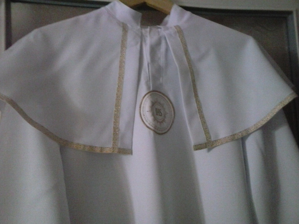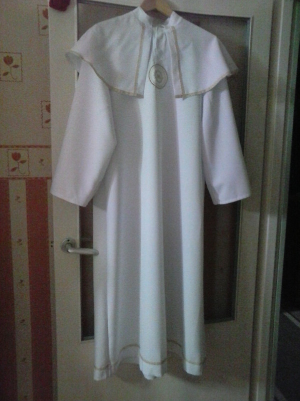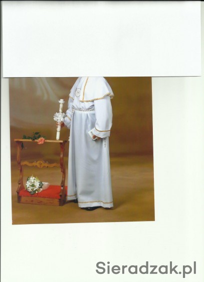 Sprzedam albę komunijną, stan bardzo dobry. Szerokość pod pachami 55x2, szerokość w ramionach 40x2, długość całkowita 124 cm, długość rękawa od pachy 40 cm.