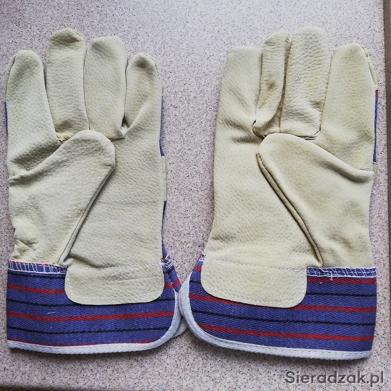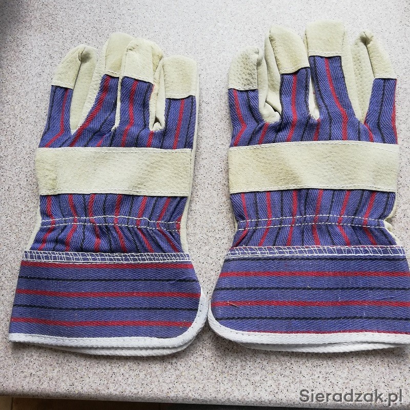 Do sprzedania rękawice robocze drelichowe wzmacniane skórą.