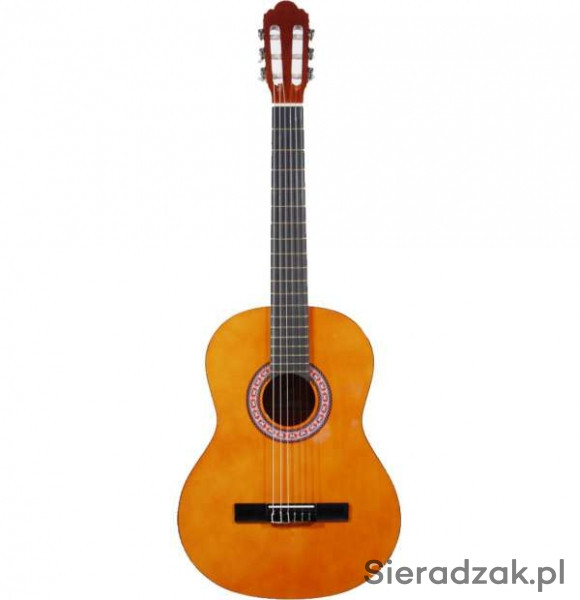 Gitara klasyczna Made in Spain 4/4, płyta wierzchnia ze sklejki świerkowej, boczki i tył wykonane ze sklejki Basswood, progi z mosiądzu, czarna malowana podstrunnica, czarny binding.