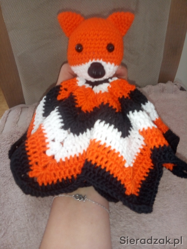 Lisek przytulanka. Jest zrobiony na szydełku, wypełniony kulką sylikonowa która można prać. Zamiast tułowia ma zrobiony ala kocyk. Jeśli ktoś by był zainteresowany jest możliwość dorobić rzędy żeby kocyk był większy(cena wtedy do uzgodnienia ) Możliwy odbiór w Sieradzu
