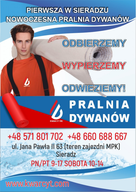 Dywany obieramy i odwozimy swoim transportem na terenie Sieradza przy zamówieniu powyżej 120,00 zł lub przyjmujemy w siedzibie firmy. Poza granicami miasta 1,20 zł za km.