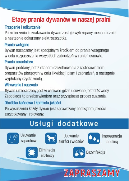 Usługi dodatkowe; wyczesywanie sierści, neutralizacja przykrych zapachów, usuwanie roztoczy, dezynfekcja, impregnacja lanoliną.