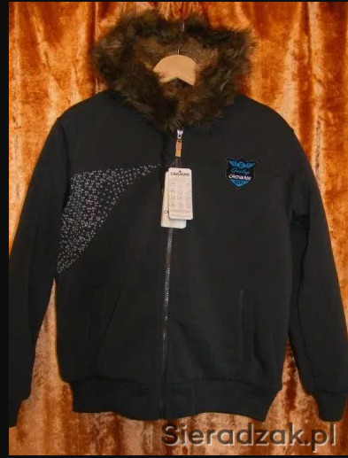 W ofercie nowa, bardzo ciepła bluza zimowa z przyszytym kapturem, zapinana na zamek, obszycie kaptura odpinane, z przodu dwie wsuwane kieszenie, dół i mankiety wykończone ściągaczem, ocieplona misiem, na lewym rękawie nadruk, ozdobna naszywka i wstawka z przodu , z powodzeniem do wykorzystania w okresie zimowym jako okrycie wierzchnie.