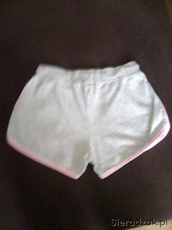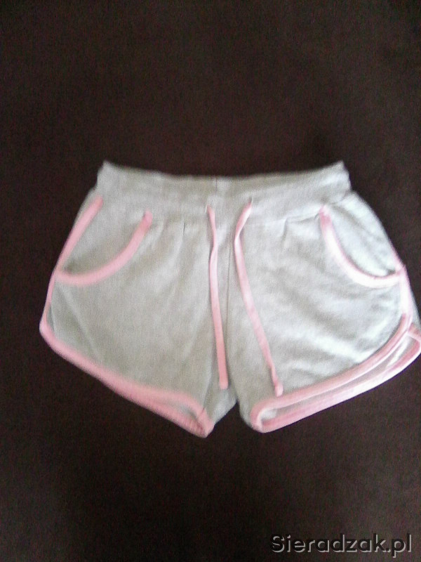 Sprzedam spodenki krótkie dziewczęce rozmiar 134. Tkanina dresowa. Kolor jasnoszary z różowymi obszyciami. W pasie taśiemka do regulacji szerokości. Dwie wpuszczane kieszenie. Stan bardzo dobry.