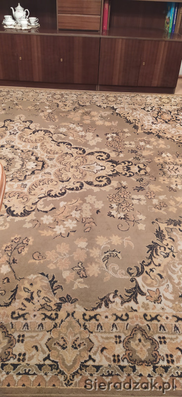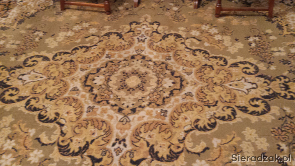 Witam, sprzedam dywan wełniany w wymiarach 3,75 m x 3,05 m. Na tle zgaszonej zieleni motywy kwiatowe w kolorze rudym, czarnym, jasno szarym.Zainteresowane osoby proszę o telefon.