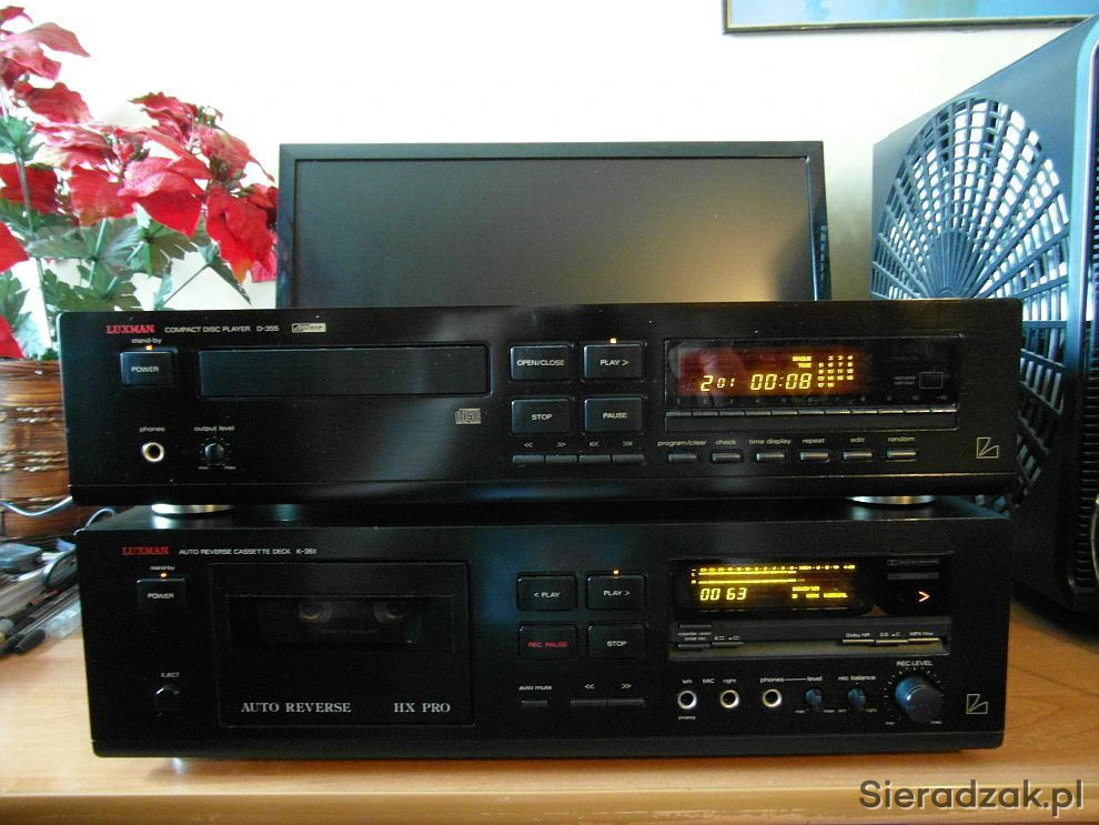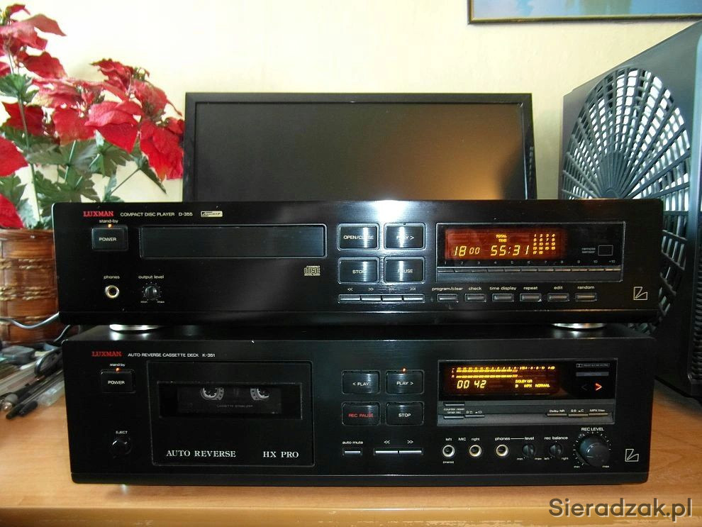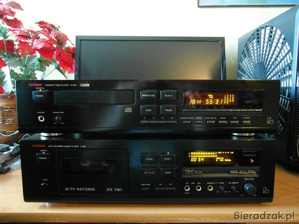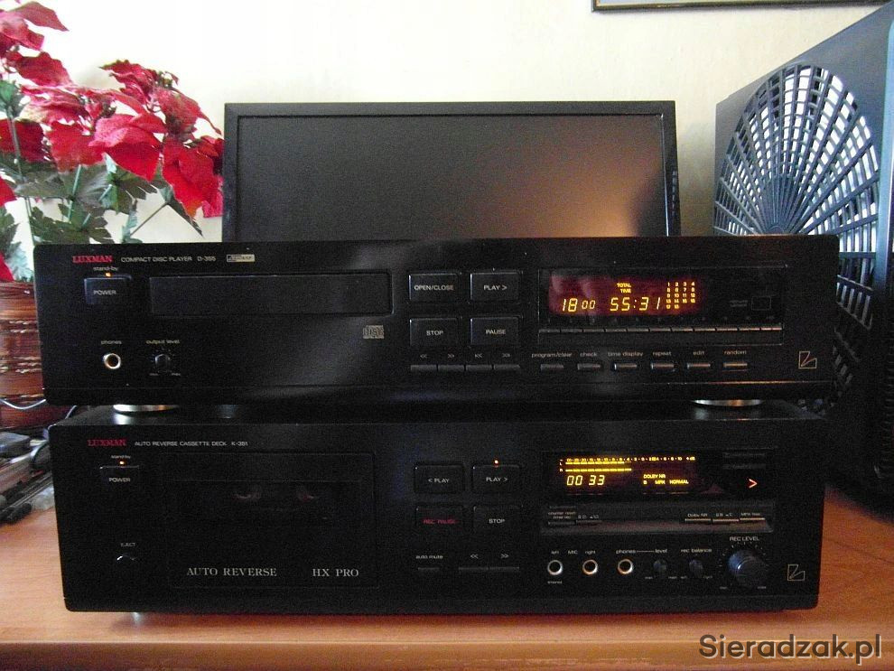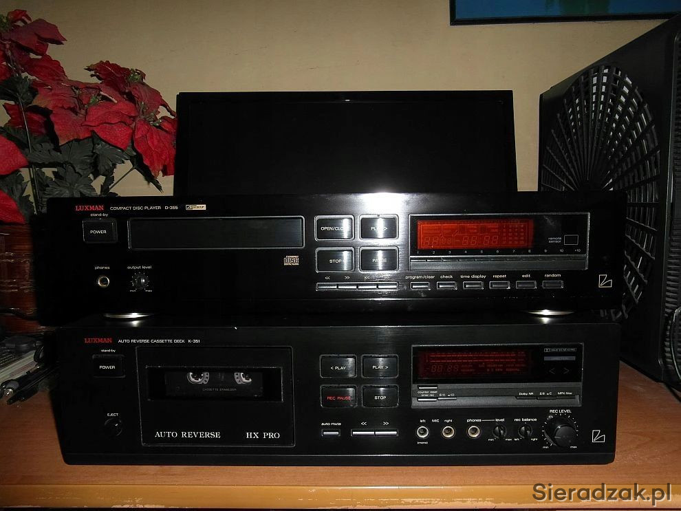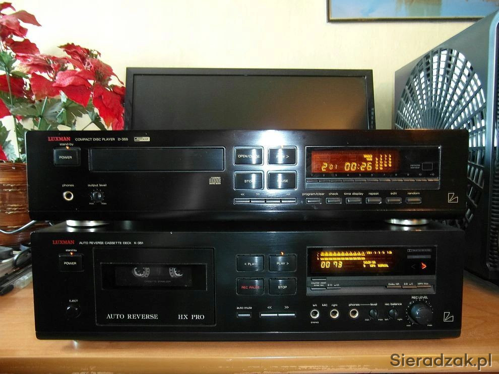 Wysokiej klasy odtwarzacz CD Luxman D-355 i magnetofon kasetowy Luxman K-351 Deck Dolby B C MPX Filter HX Pro Autoreverse. Ciepły analogowy dźwięk kto miał Luxmana wie jak potrafi zagrać.