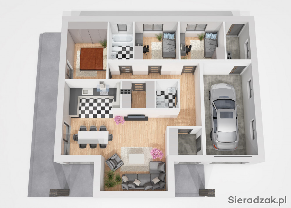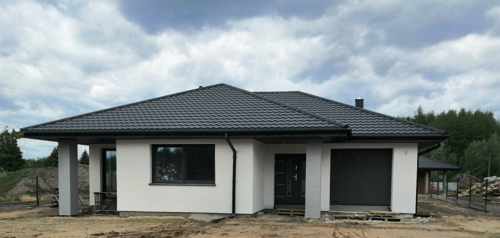 Po przekroczeniu progu domu oczom ukazuje się salon z jadalnią oraz jasna kuchnia dodatkowo znadują się 3 sypialnie łazienka, w-c, garaż i pom kotłowni. Wszystko to dopełnia otwarty taras z widokiem na spokojną okolicę, który jest idealnym miejscem do spędzania letnich wieczorów.