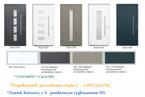 Płyta drzwiowa: 73 mm z przegroda termiczną, ościeżnica 80 mm z przegrodą termiczną.