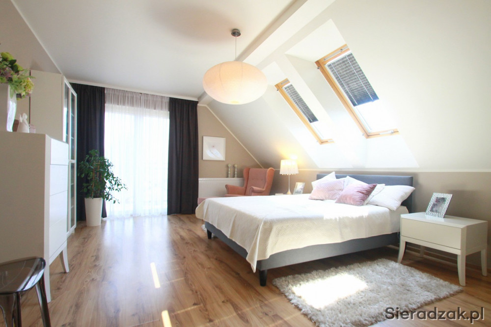 Na poddaszu zaprojektowano trzy duże, jasne sypialnie i wygodną łazienkę.