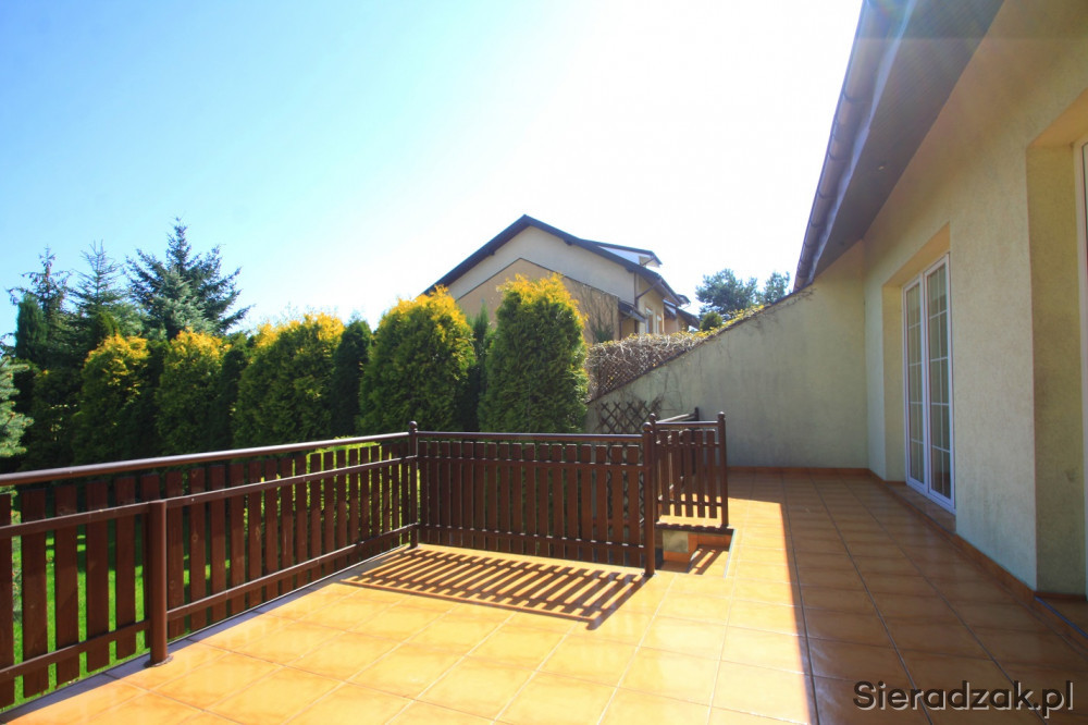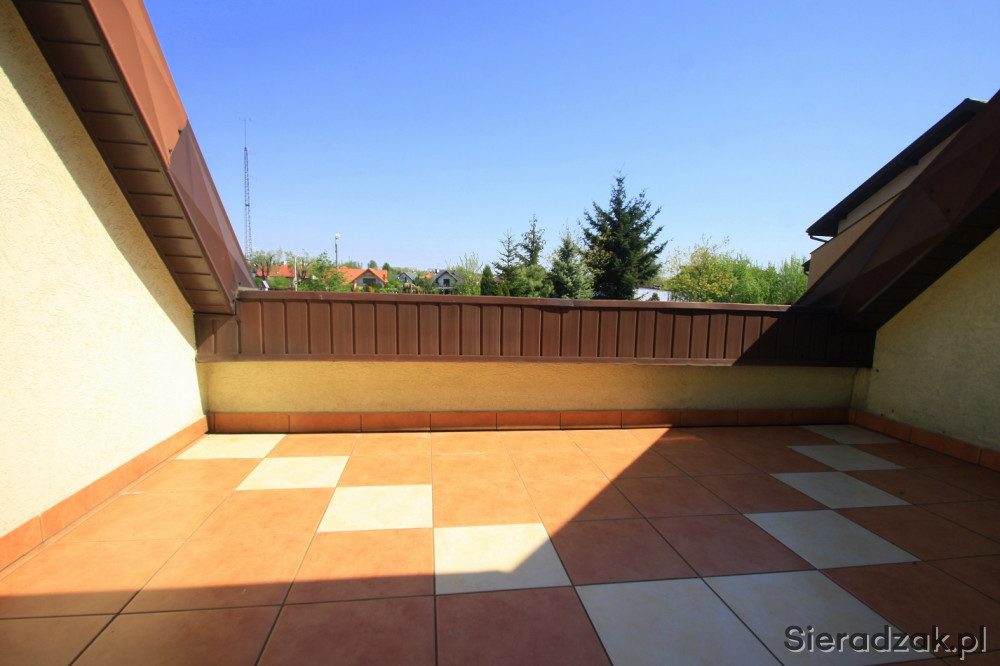 Całość uzupełnia duży taras i balkon na poddaszu, oba wyłożone płytkami mrozoodpornymi (wyjście na balkon z jednej z sypialni).