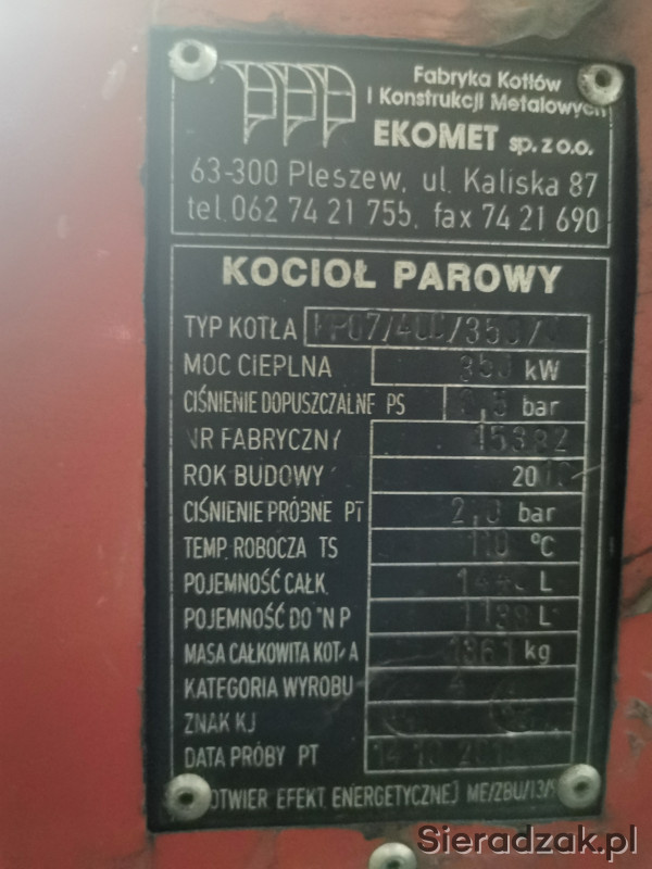 Kocioł parowy Ekomet 2010 rok, 350 kW ciśnienie robocze 0,5 Bar