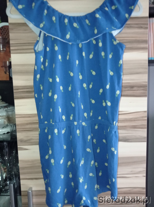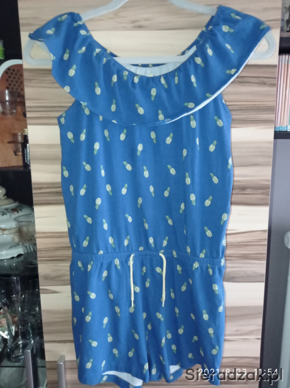 Kombinezon dziewczęcy letni niebieski w ananasy rozm. 146/152. Długość 72 cm. Szerokość w pasie do 40cm