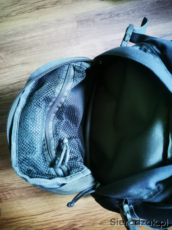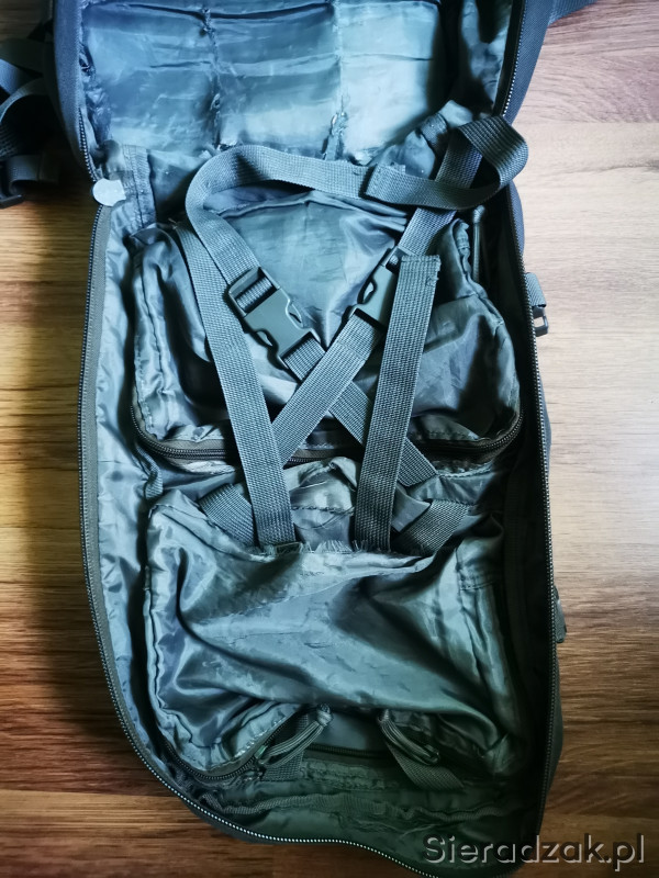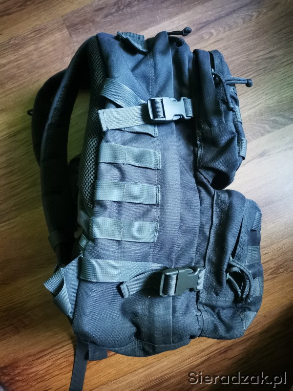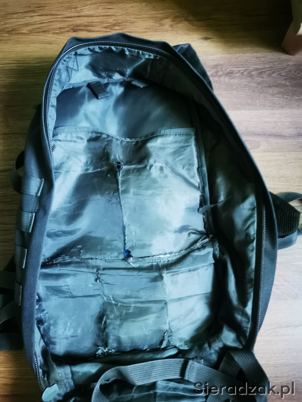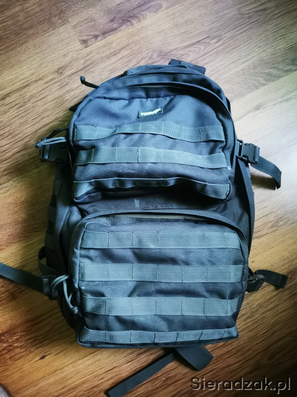 3 letni plecak marki Texar (modelu nie pamiętam) o pojemności około 30-35 litrów. Jedna duża komora z miejscem na camelback oraz trokami do uporządkowania bagażu. Dwie małe kieszenie od frontu z dodatkową siatkową kieszonką w środku. Wszystkie trzy kieszenie posiadają dwukierunkowe zamki. Plecak posiada pas piersiowy oraz biodrowy (regulowane). Istnieje możliwość doczepienia do plecaka kieszeni w systemie molle/pals. Plecak posiada wewnątrz ślady użytkowania.