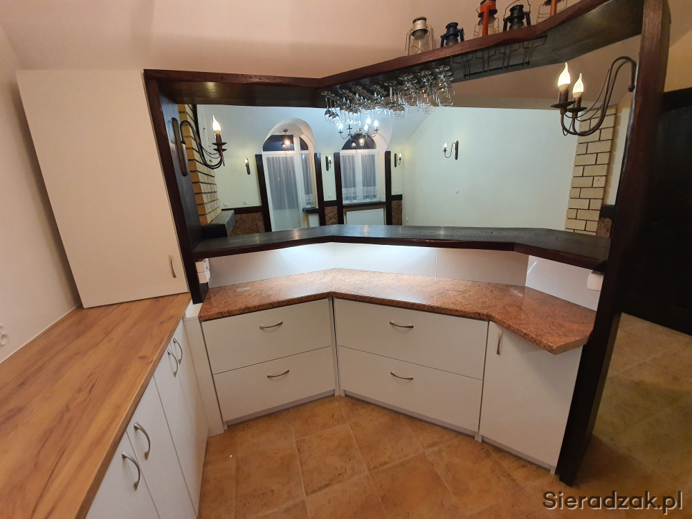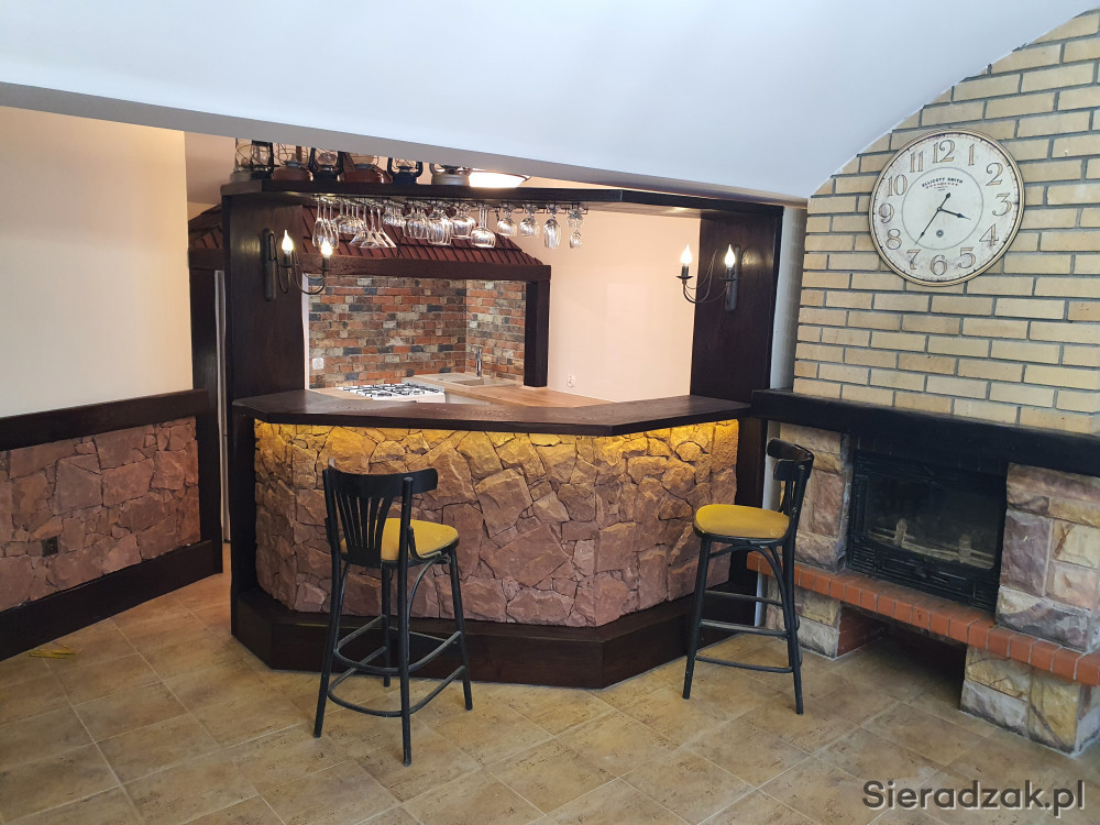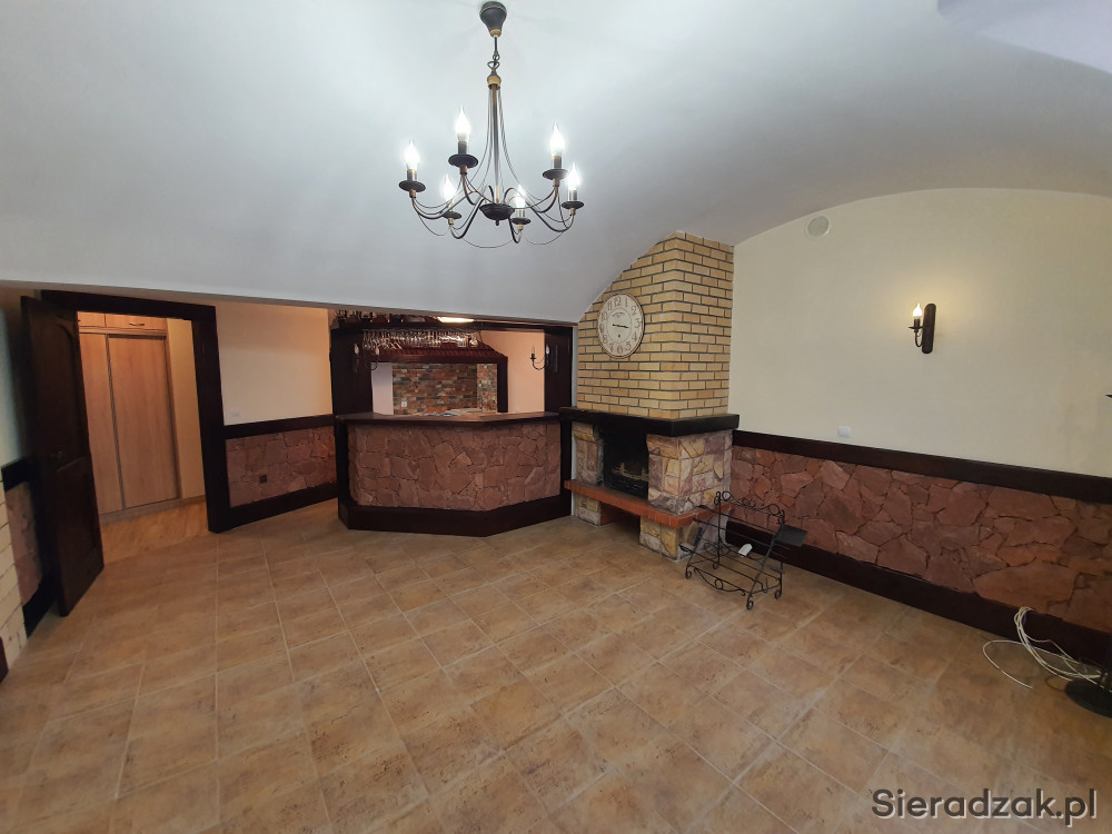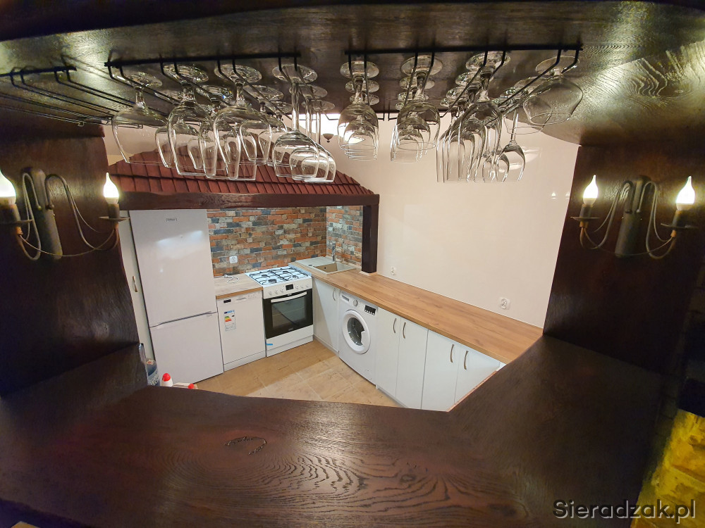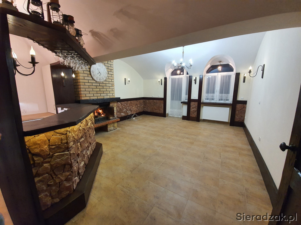 - pokój gościnny 33m2 z aneksem kuchennym i kominkiem. Piękny bufet i wykończenia z naturalnego dębu i łupków piaskowca bordowego. Sklepienie pokoju i okien w kształcie łuku. W aneksie kuchennym sprzet AGD z 5 letnią gwarancją( lodówko - zamrażarka, pralka, zmywarka, kuchnia gazowa (60cm) z piekarnikiem elektrycznym.