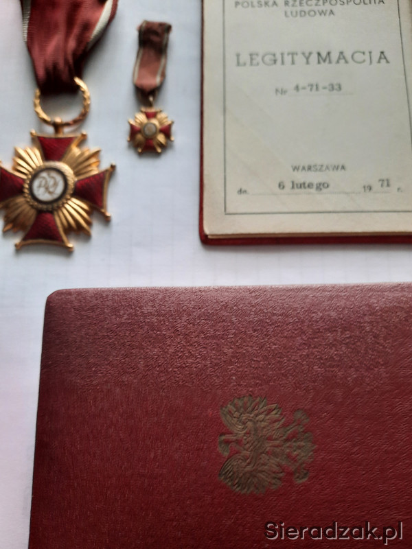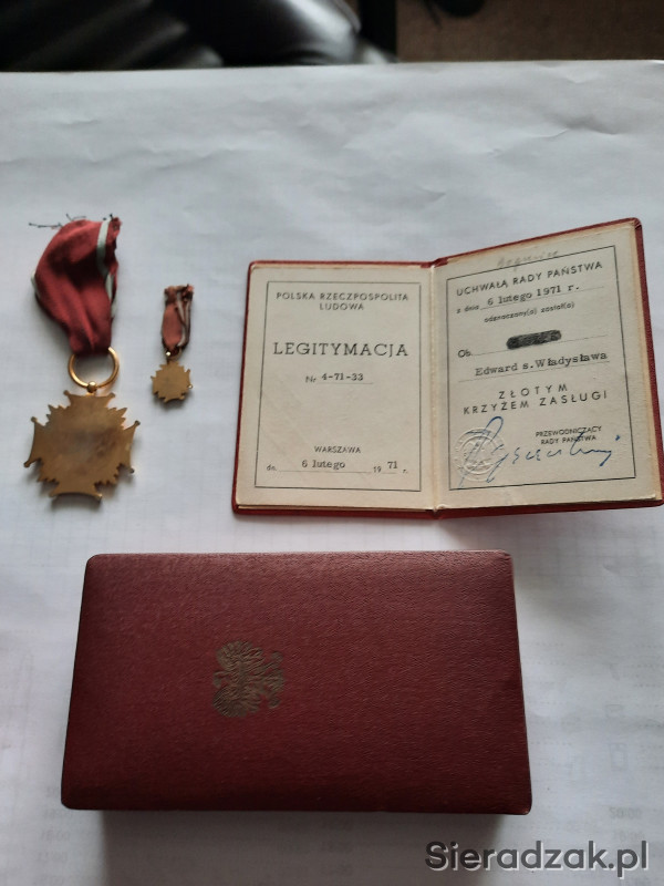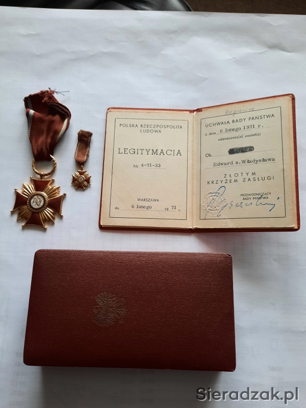 Złoty krzyż zasługi. Komplet - z miniaturką, wstążkami, etui i legitymacją z 1971r.
