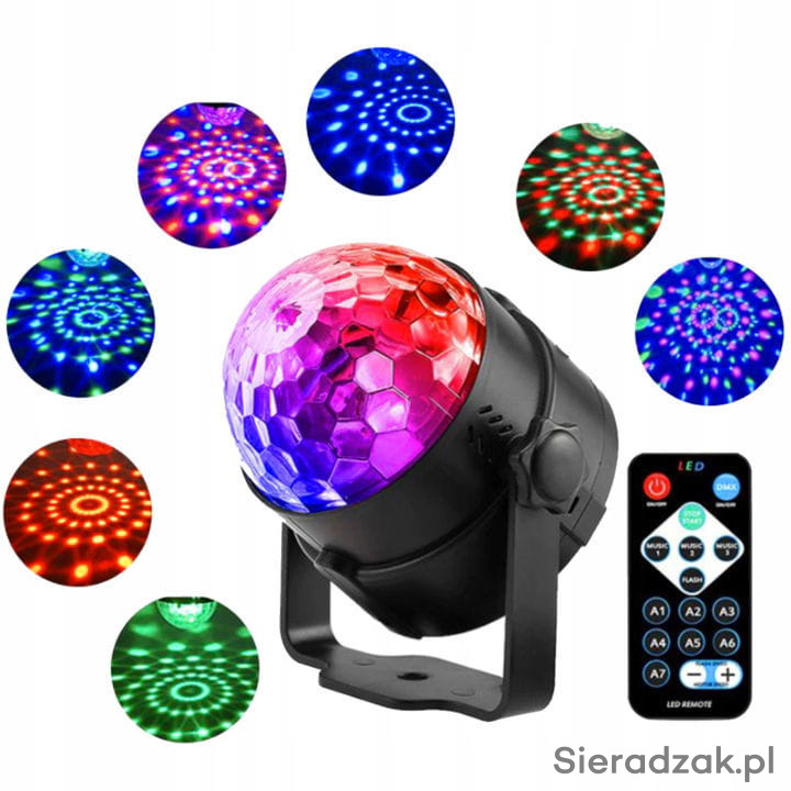 Kula dyskotekowa LED to gadżet idealny na imprezę, domówkę, dyskotekę, festyn czy do zabaw dla dzieci. Kula świeci w 7 różnych kombinacjach kolorystycznych a wbudowany czujnik reaguje na muzykę i dostosowuje efekty świetlne do tempa. Do obsługi kuli służy pilot, samo urządzenie zasilamy z gniazdka elektrycznego 230V.