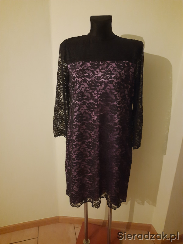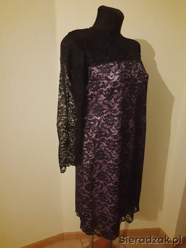 Czarna koronkowa sukienka z fioletowym podbiciem. Rozmiar 44/46 całkowita długość mierzona od szwu ramienia 97 cm, dopasowana zaszewkami. Sukienka czysta, bez plam, uszkodzeń i przebarwień. Polecam!