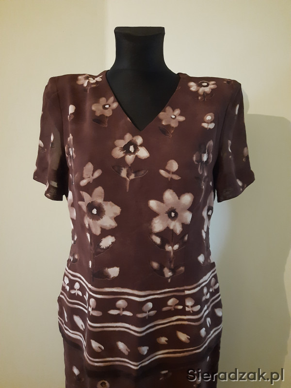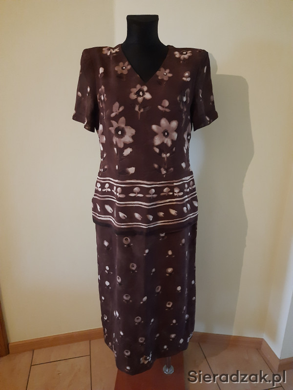 Oryginalna sukienka na podszewce w kolorze intensywnego brązu i wzorami w odcieniu ciepłej bieli i beżu. Rozmiar 44, zaprojektowana tak, że wygląda jak spódnica i bluzka, tkanina tworzywo sztuczne. Model dopasowany zaszewkami, wyszczuplający. Używana kilka razy, czysta i zadbana.