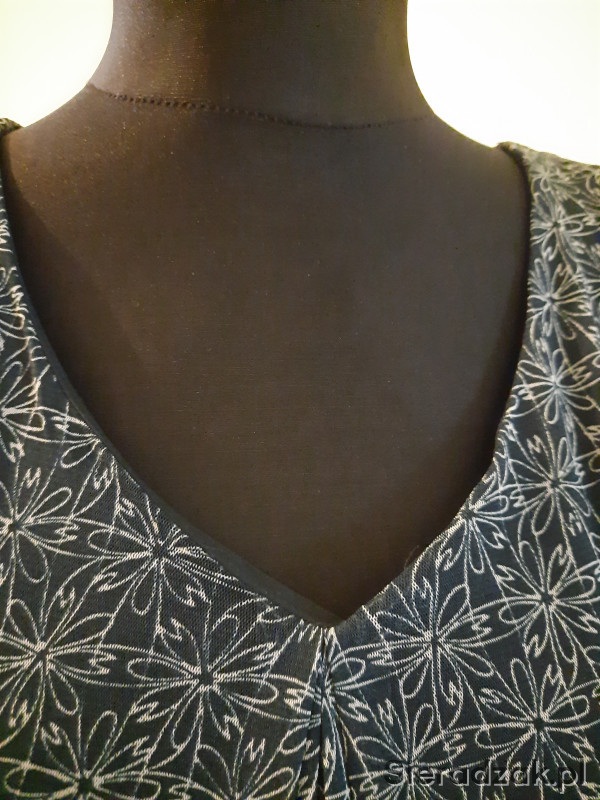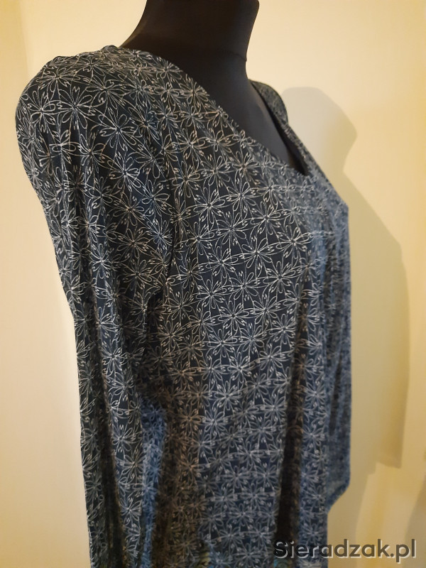 Pięka bluzka w kolorze butelkowej zieleni w białe wzory z cienkiej, lekkiej, syntetycznej tkaniny na podszewce (podszewka tylko na tułowiu). Rozmiar 44, bez plam i uszkodzeń, używana sporadycznie 3-4 razy. Bluzka szczególnie polecana dla kobiet z większym biustem - polecam!
