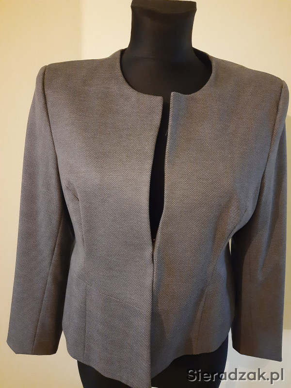 Piękny, krótki żakiet na podszewce firmy QUIOSQUE , bez zapięcia z przodu i kołnierza, rozmiar 44. Lekka, miękka tkanina w kolorze odcieni szarości, czysty i zadbany, używany 2-3 razy. Polecam!
