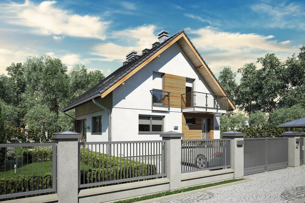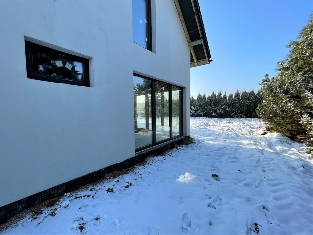 Na dachu ceramiczna, wielkoformatowa dachówka SIMPLA - nowoczesna , płaska w rozmiarze XL. Format ok. 300 x 500 mm. Wyróżnia się wyjątkowym wzornictwem i najlepszymi parametrami użytkowymi. Cechuje ją najwyższa jakość i trwałość. System rynien GALECO – PCV Z 15-letnią gwarancją na uszkodzenia mechaniczne. Niezwykle trwałe i estetyczne. Działka ogrodzona siatką, z trzech stron porośnięta wysokimi iglakami, tworzącymi wysoki, zielony żywopłot.