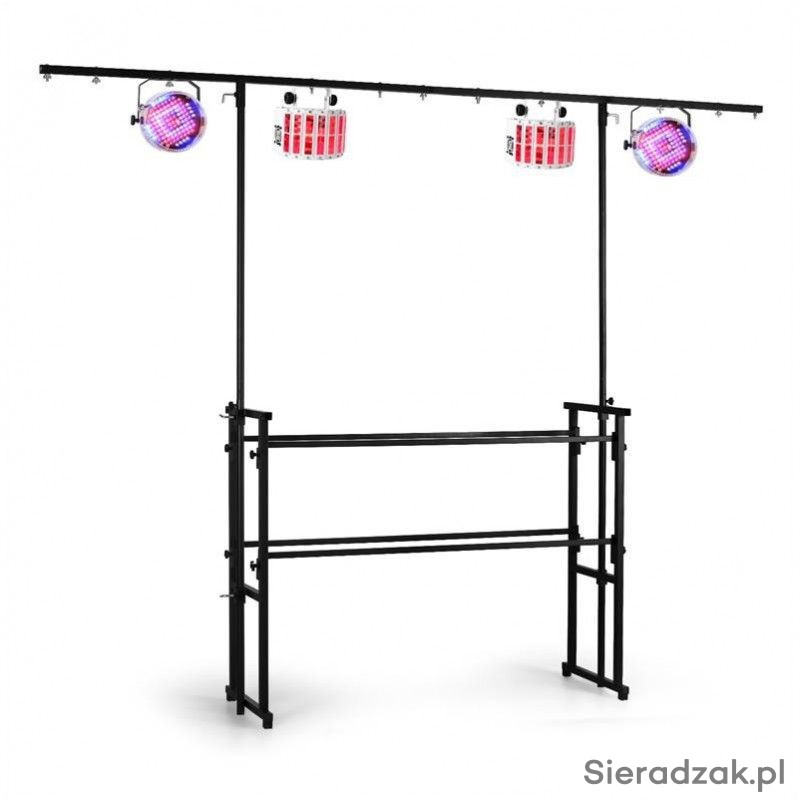 Wysokiej jakości uniwersalny, 4-stopowy statyw, będący doskonałym rozwiązaniem dla mobilnych DJ-ów. Cała konstrukcja ma szerokość 1,2 m i jest wystarczająco wytrzymała, żeby utrzymać większość mobilnych urządzeń estradowych. Stelaż wyposażony został w dwie półki. Górna zaprojektowana została z myślą o konsoletach i stołach mikserskich. Dolna idealnie nadaje się do ustawiania na niej wzmacniaczy, procesorów dźwięku czy kontrolerów oświetlenia. Poprzeczka oświetleniowa ma szerokość 260 cm i możliwość regulacji wysokości od 215 do 246 cm. Posiada też 11 otworów montażowych pasujących do niemal wszystkich efektów świetlnych, reflektorów czy urządzeń estradowych. Opcjonalny pokrowiec zapewnia łatwy transport (do kupienia na osobnej aukcji). To idealny stand, szczególnie dla mobilnych DJ-ów.
