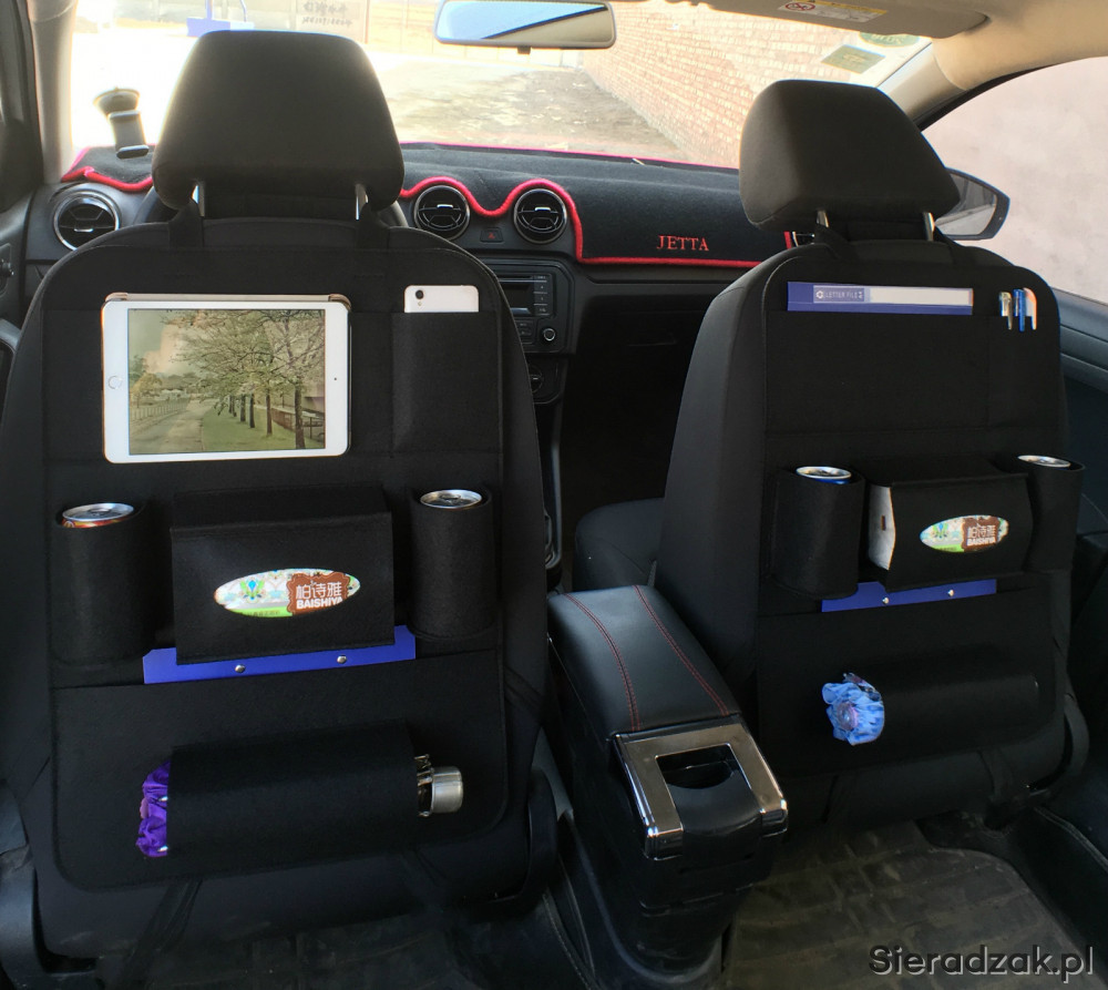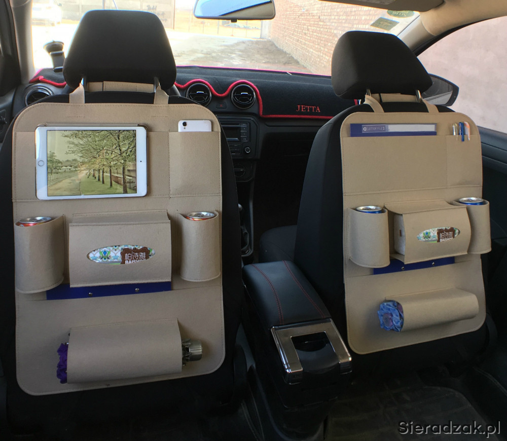 Organizer może pomieścić mniej lub bardziej potrzebne rzeczy w podróży typu: długopisy, mapy, czasopisma, przekąski, kanapki, napoje w butelkach i puszkach, smartfony, tablet, składany parasol itp.