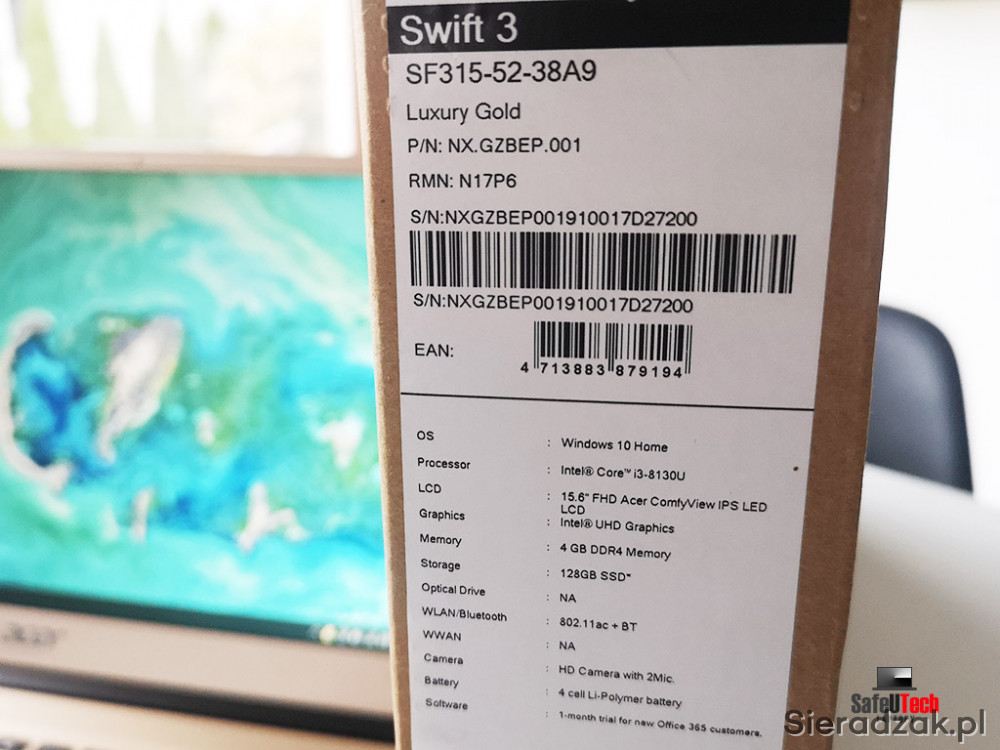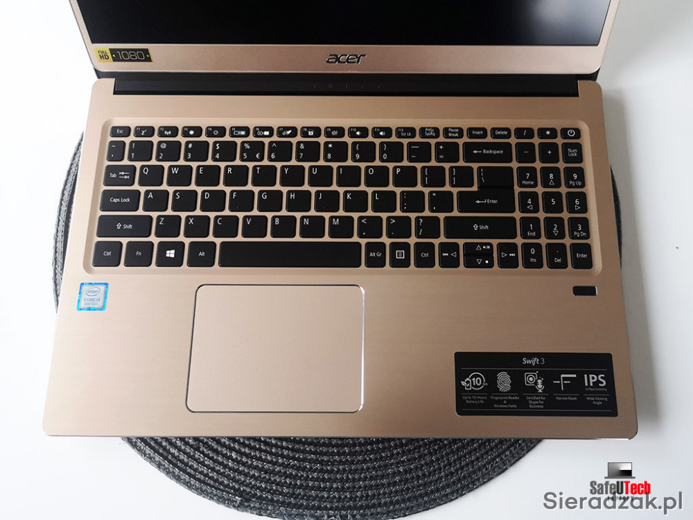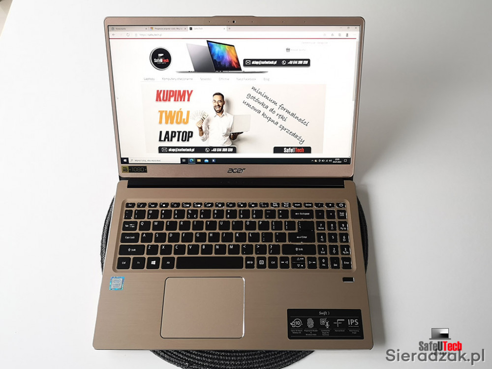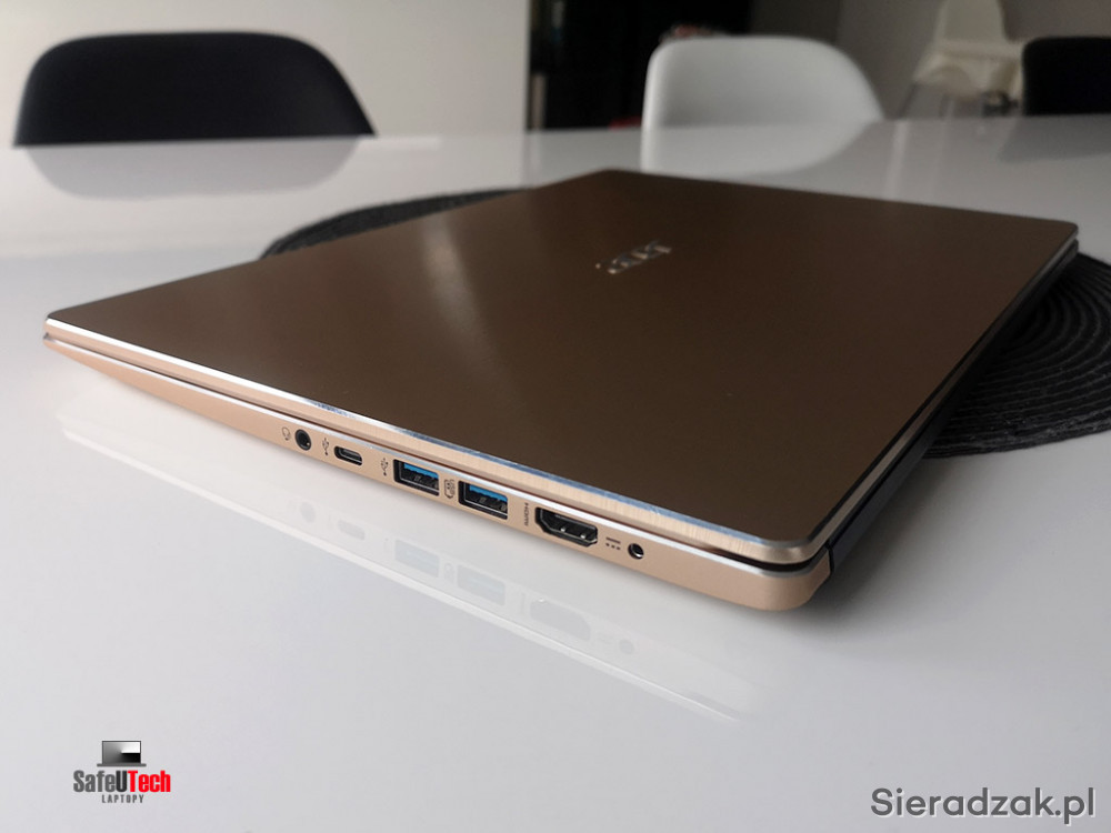 Do sprzedania oferujemy bardzo zadbanego ultrabook'a Acer Swift 3 (SF315-52-38A9) z dwurdzeniowym procesorem Intel i3-8130u 2x2.2 GHz (do 3.4 GHz TURBO, 4 MB pamięci CACHE L3), 4 GB RAM, dyskiem SSD 128 GB, zintegrowaną kartą graficzną Intel UHD 620, USB-C, 2xUSB 3.0, USB 2.0, HDMI, BLUETOOTH, czytnikiem linii papilarnych, matowym ekranem 15,6 cali IPS w rozdzielczości FHD 1920x1080 oraz podświetlaną klawiaturą.