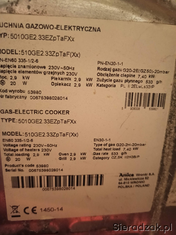 Sprzedam kuchenkę gazowo-elektryczna Amica INOX 50cm