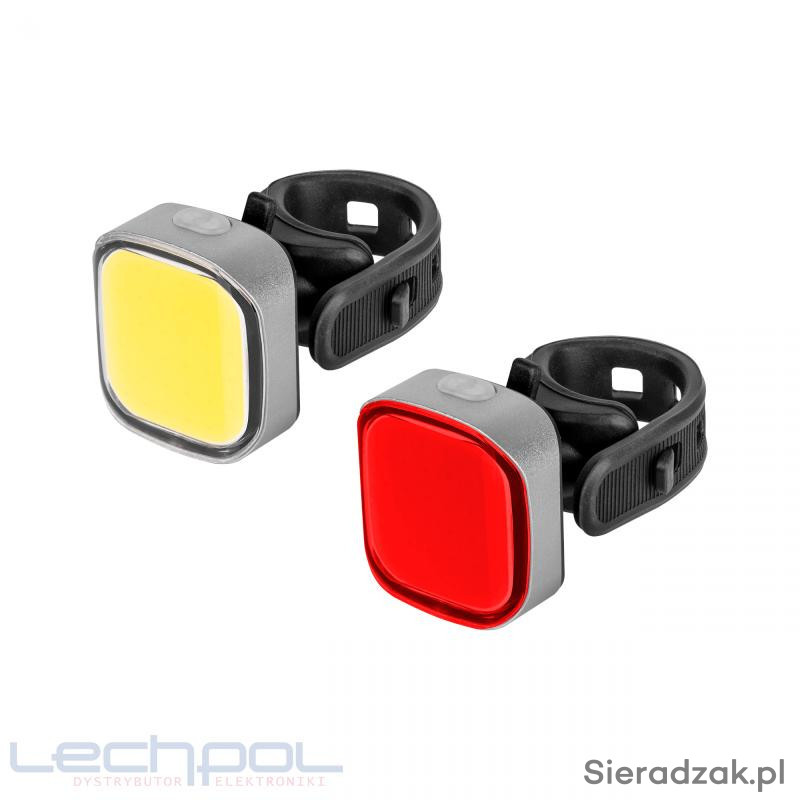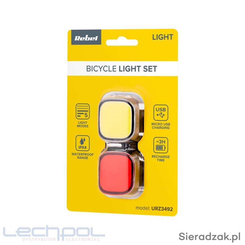 W zestawie: lampa przednia, lampa tylna, przewód micro USB