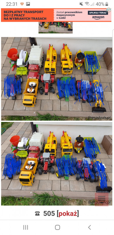 Dźwigi i traktorki w cenach od 60 do 90zł za sztukę. Przyczepa za 70zł, Wywrotka 60zł, Śmie..ciarka 50zł, .koparka 60zł.