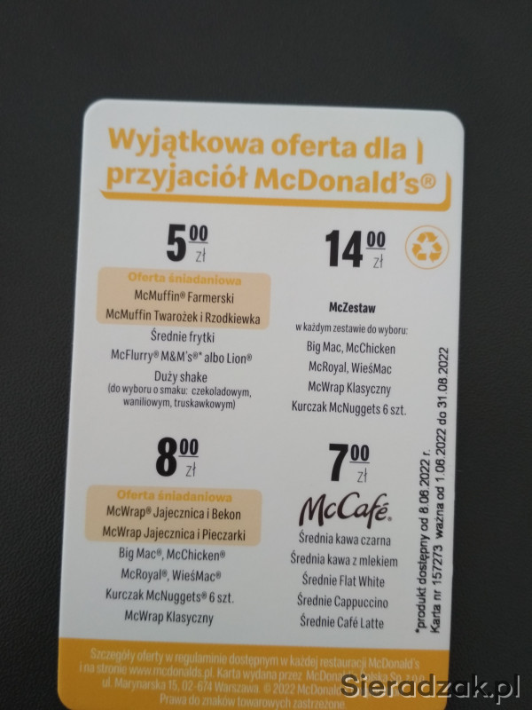 Bonifikarta MC Donald's ważna 3 miesiące do 31.08.2022 Została ostatnia sztuka!