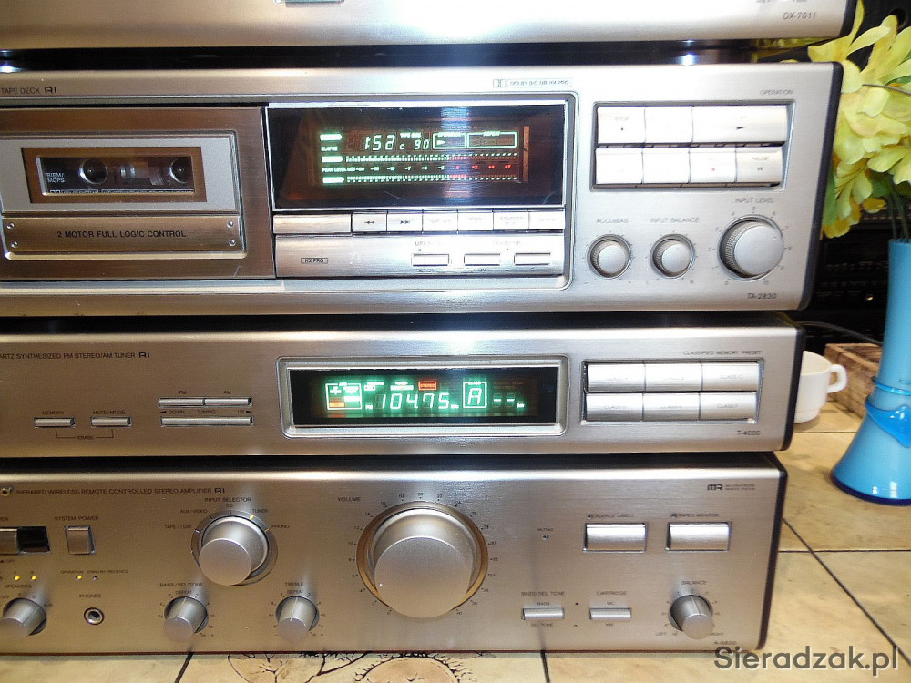 Cały komplet wzmacniacz tuner radiowy magnetofon i odtwarzacz CD w kolorze tytanowym wraz z pilotem.