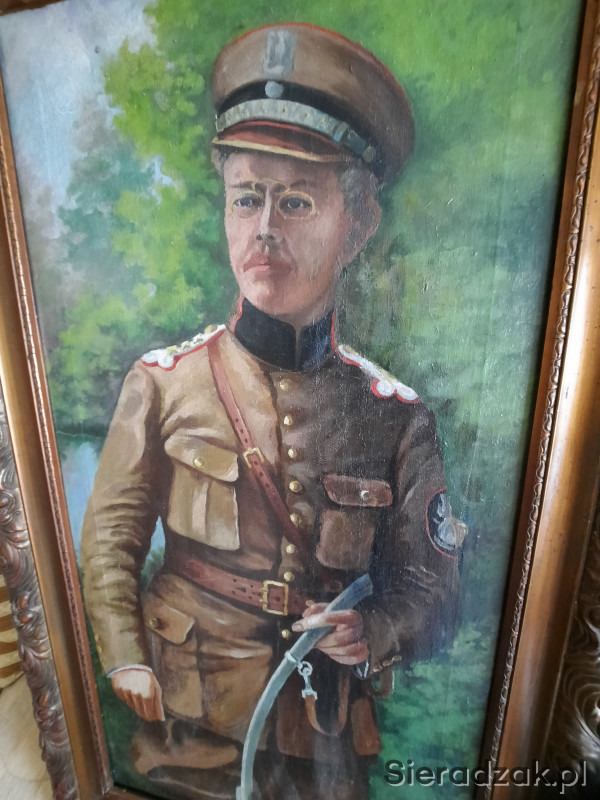 Obraz - olej na płótnie. Oficer w mundurze z lat 1918 - 1920. Ozdobna stara rama. Niesygnowany. Wymiary 120 x 70 cm.
