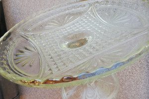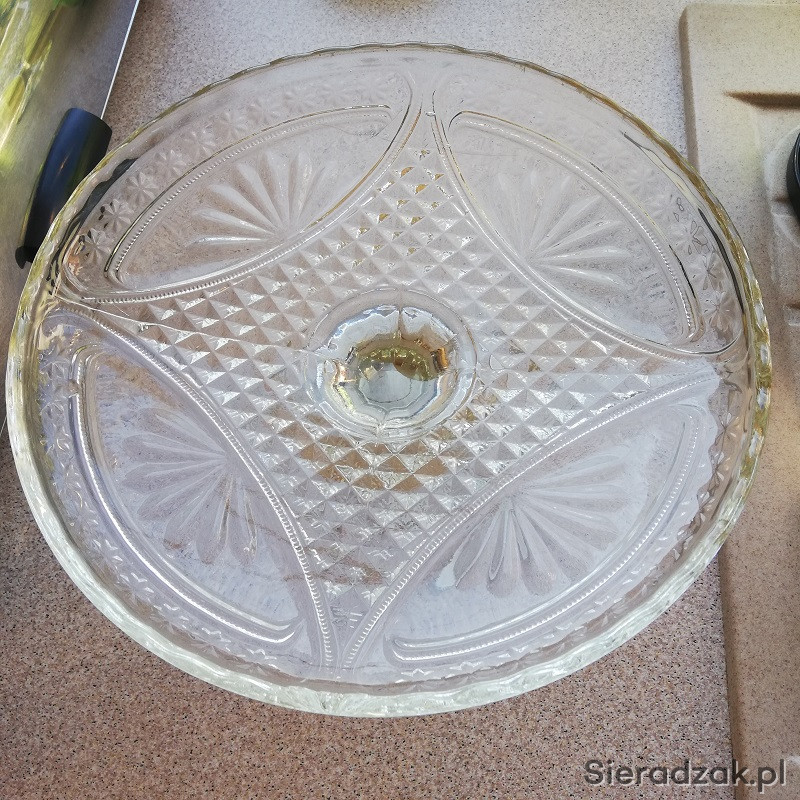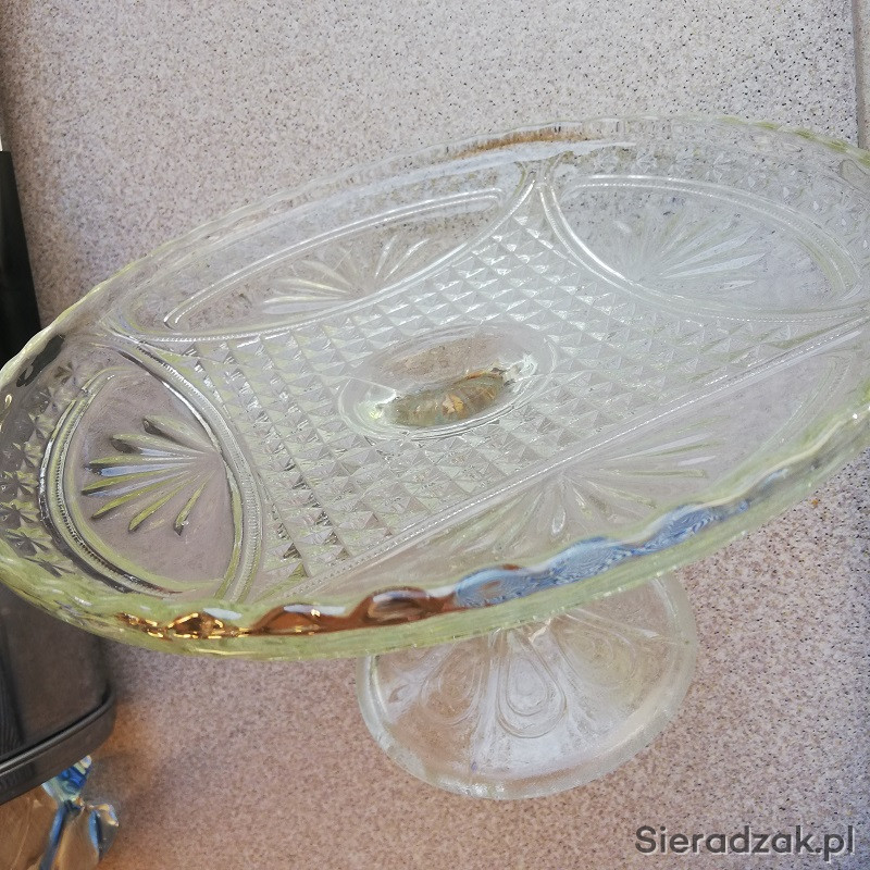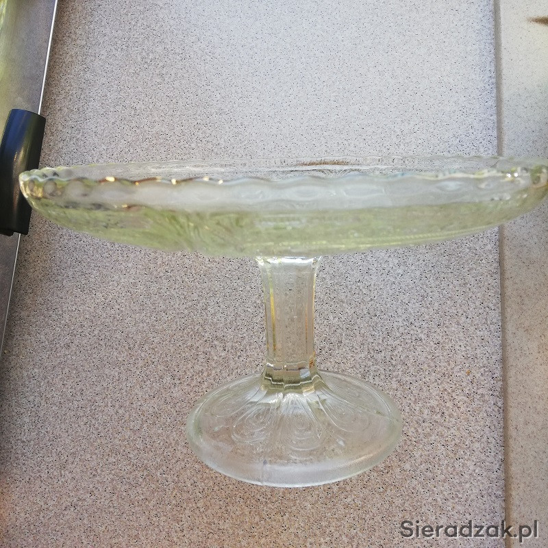 Patera z lat PRL z grubego szkła na nóżce na ciasto lub owoce.