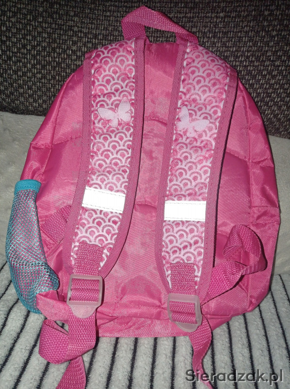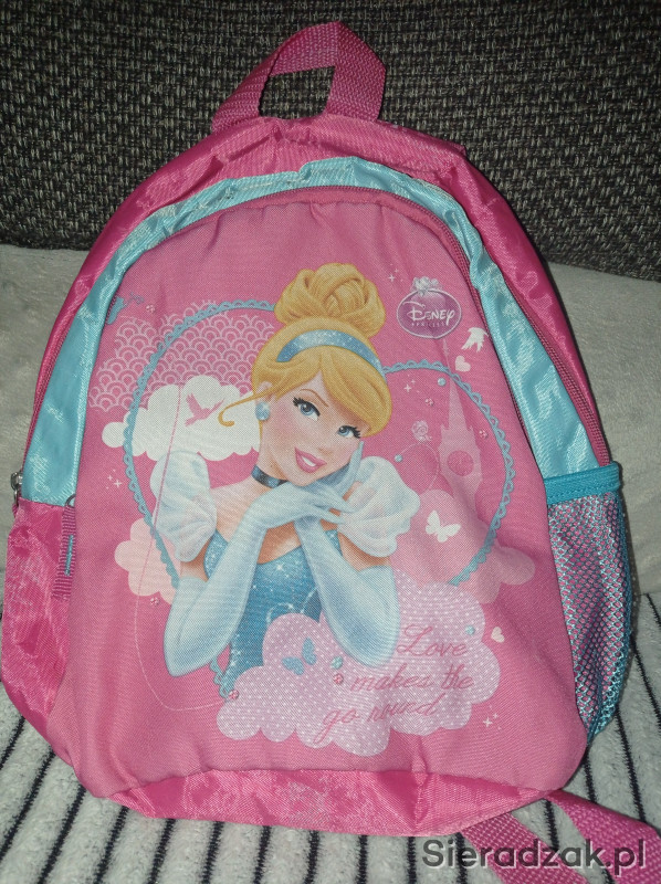 Plecak mały dziecięcy z motywem księżniczki Disneya. Dwie kieszenie zapinane na zamek oraz boczna kieszonka na napój. Kolor różowo-turkusowy