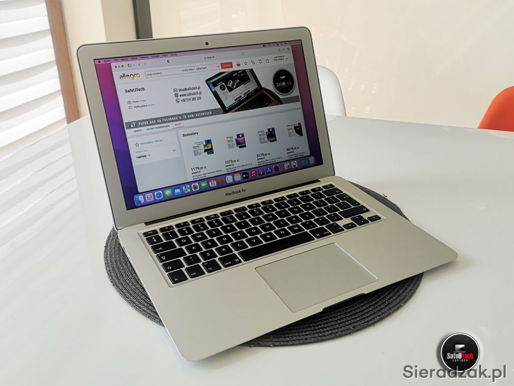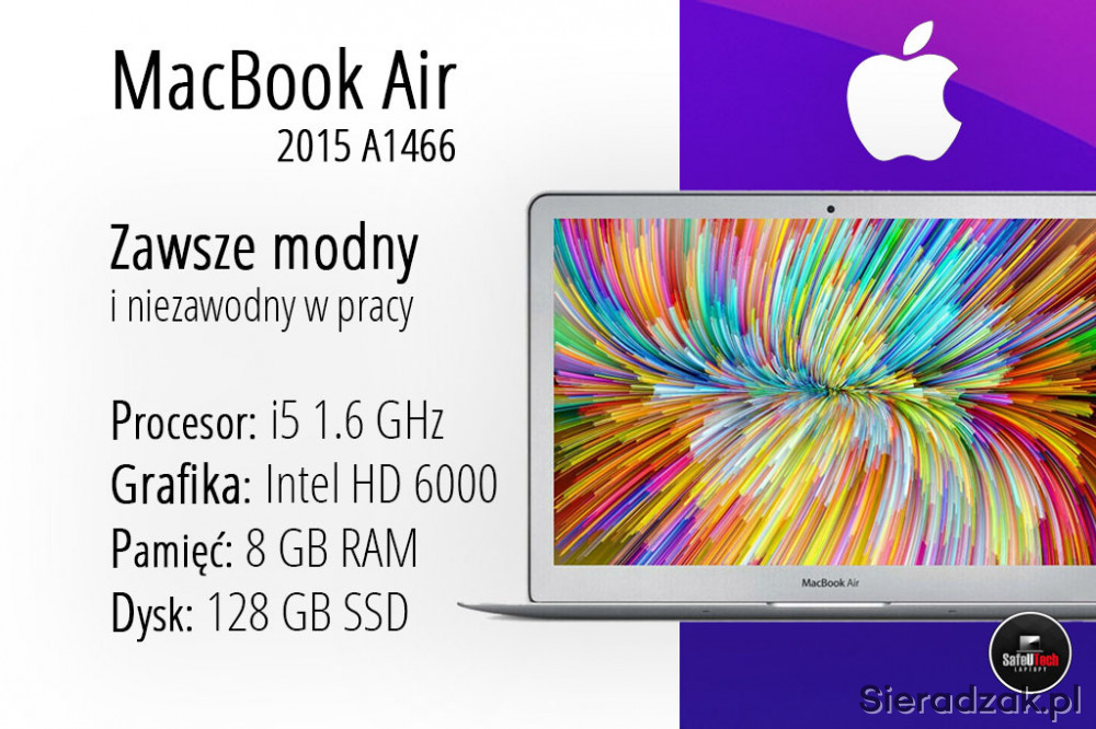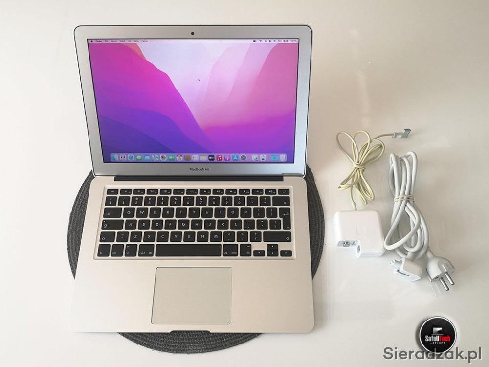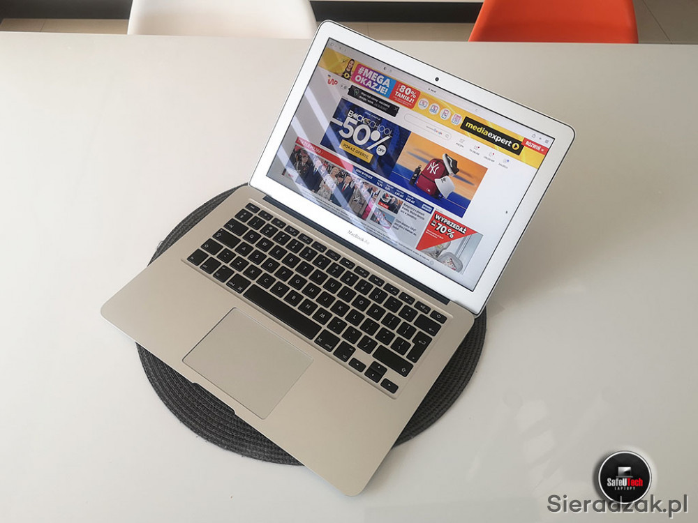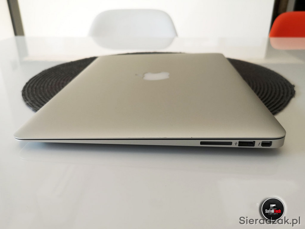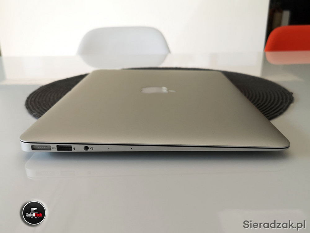 Do sprzedania oferujemy zadbanego MacBook'a Air 13 A1466 (2015) z dwurdzeniowym procesorem Intel i5 2x1.6GHz (do 2.7 GHz TURBO, 3MB CACHE), 8 GB RAM, dyskiem SSD 128 GB, zintegrowaną kartą graficzną Intel HD 6000, 2xUSB 3.0, złączem Thunderbolt (z miniDisplayPort), BLUETOOTH, błyszczącym ekranem w rozdzielczości 1440x900, podświetlaną klawiaturą oraz mocną i niewyeksploatowaną baterią (tylko 87 cykli ładowania i 95% fabrycznej pojemności).