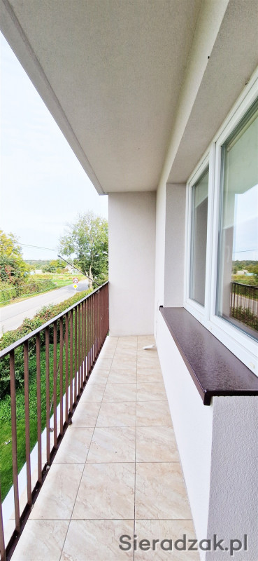 Z wyjściem na balkon loggia z widokiem na ogródki działkowe znajdujące się za drogą.