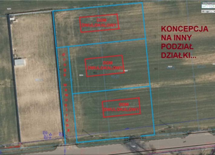 Teren składa się z identycznych prostokątnych (ok 25x75m) działek, każda z własnym wjazdem - można zakupić obie i uzyskać bezproblemowo WZ na 2 spore domy jednorodzinne ok 220mk pow. zabudowy (dla każdej z działek osobno) ale ze wstępnych rozmów w gminie jest szansa na wydzielenie z tego gruntu 3 działek po ok 1150mkw każda + droga wewnętrzna i uzyskanie WZ na 3 domy (a sprytny deweloper zapewne zrobi z tego 3 bliźniaki dwulokalowe = 6 domów) - przykład takiej koncepcji podziału na ostatnim zdjęciu. Istnieje możliwość dokupienia sąsiedniej dzialki o identycznych parametrach co razem da grunt ok 0,75ha i możliwość postawienia nawet 6 domów (12 lokali...).