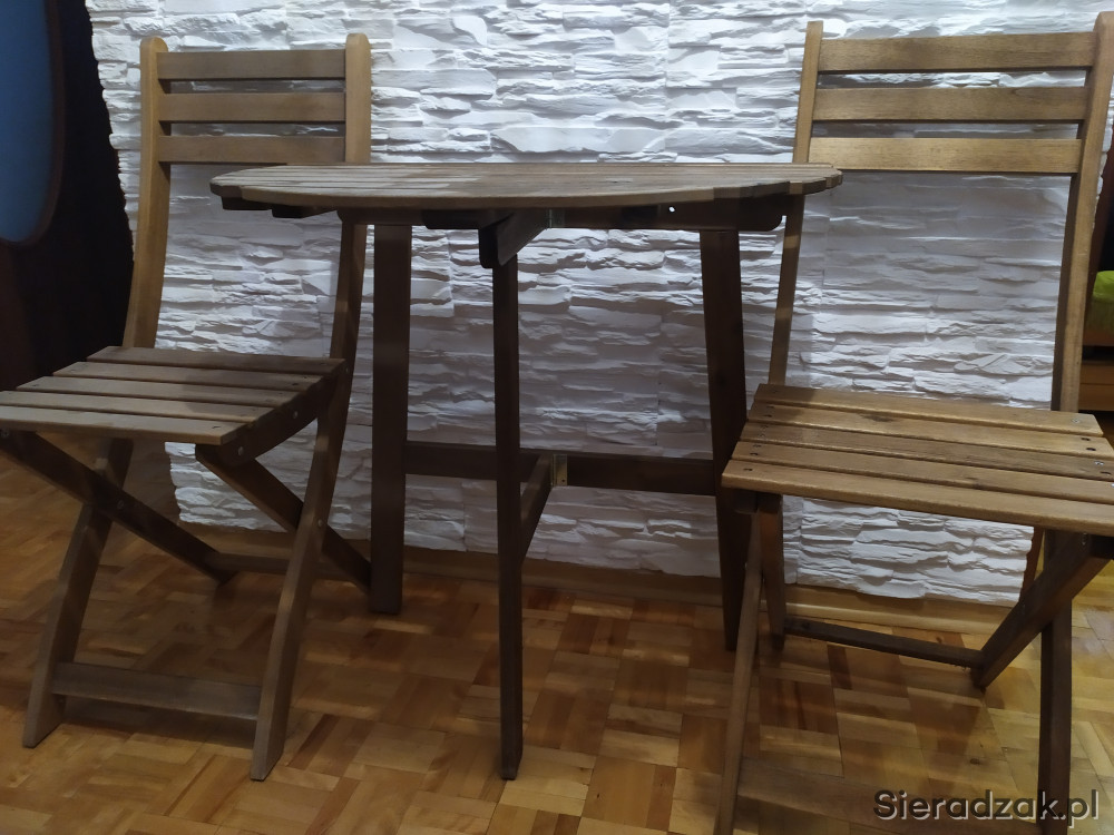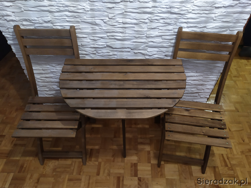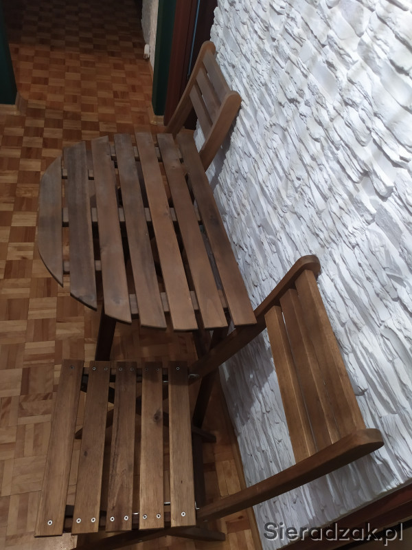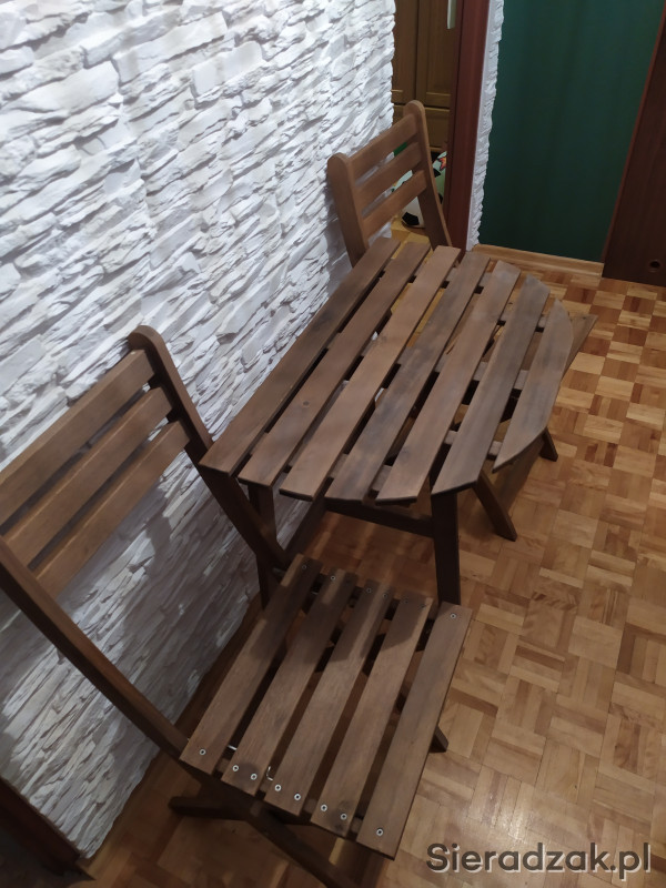 Stół i dwa krzesła drewniane,idealne na balkon i taras. Zajmują bardzo mało miejsca. Stół i krzesła są składane. Cały zestaw jak nowy używany przez jeden sezon.