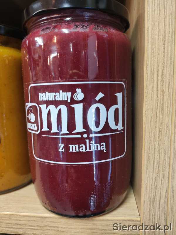 Miód wielokwiatowy nektarowy z maliną z polskiej pasieki SUSZKA.100%naturalny.Skład to naturalny miód wielokwiatowy 95% i liofilizowana malina 5%. Słoik 900 g.