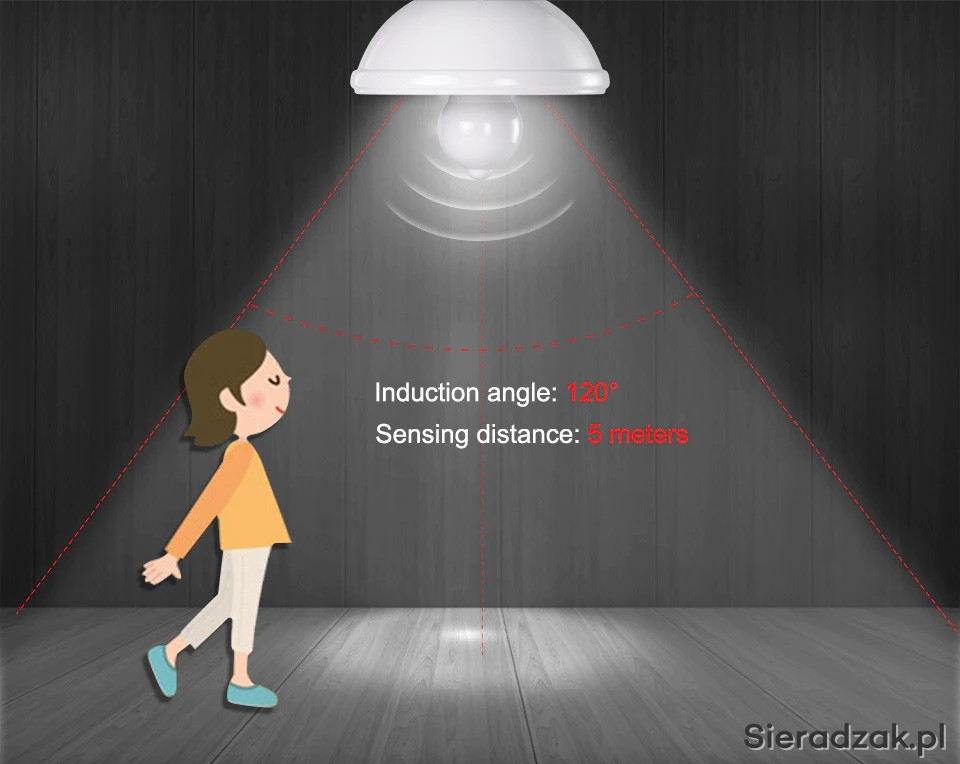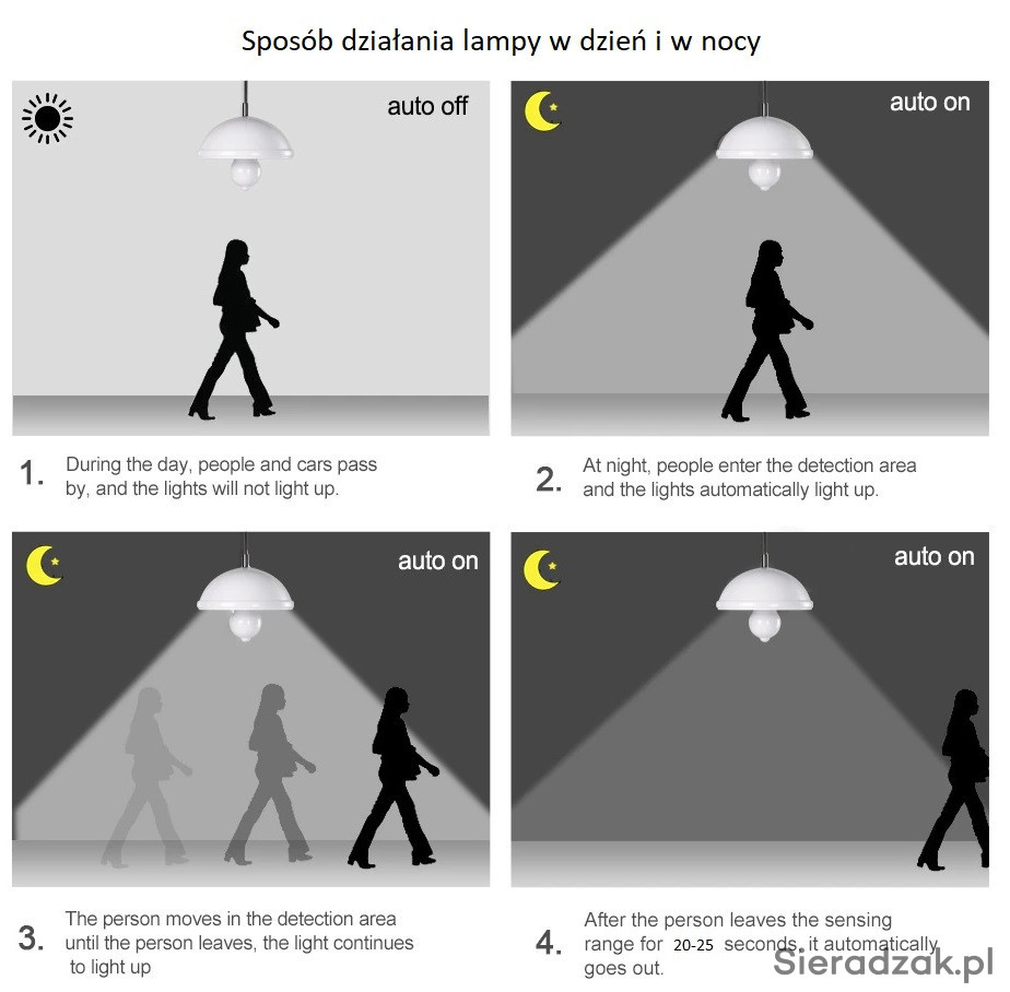 4. Żarówka wyłącza się po 20 sekundach, jeśli nie wykryje żadnego ruchu. W ciągu dnia lampa nie uruchomi się, działa tylko w ciemnym otoczeniu lub w nocy.