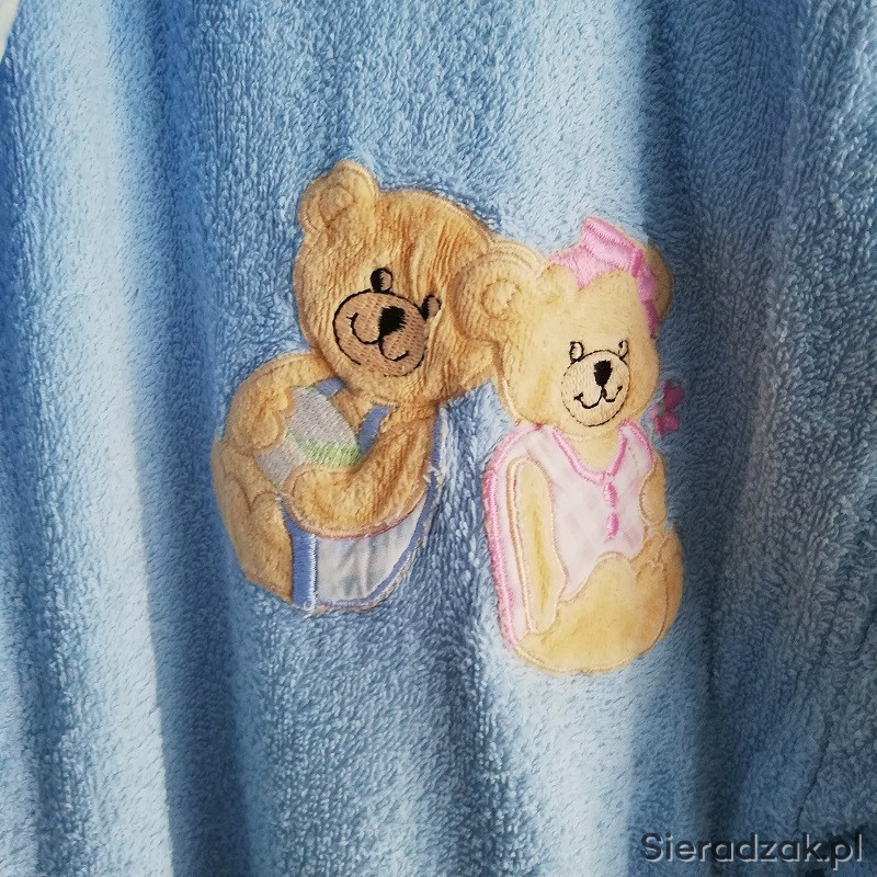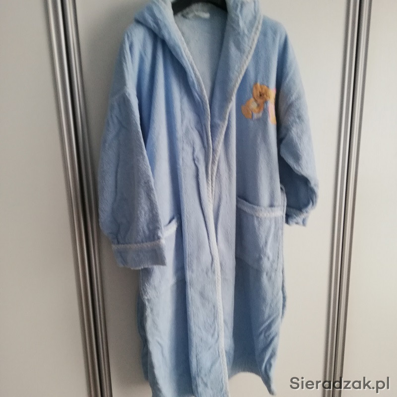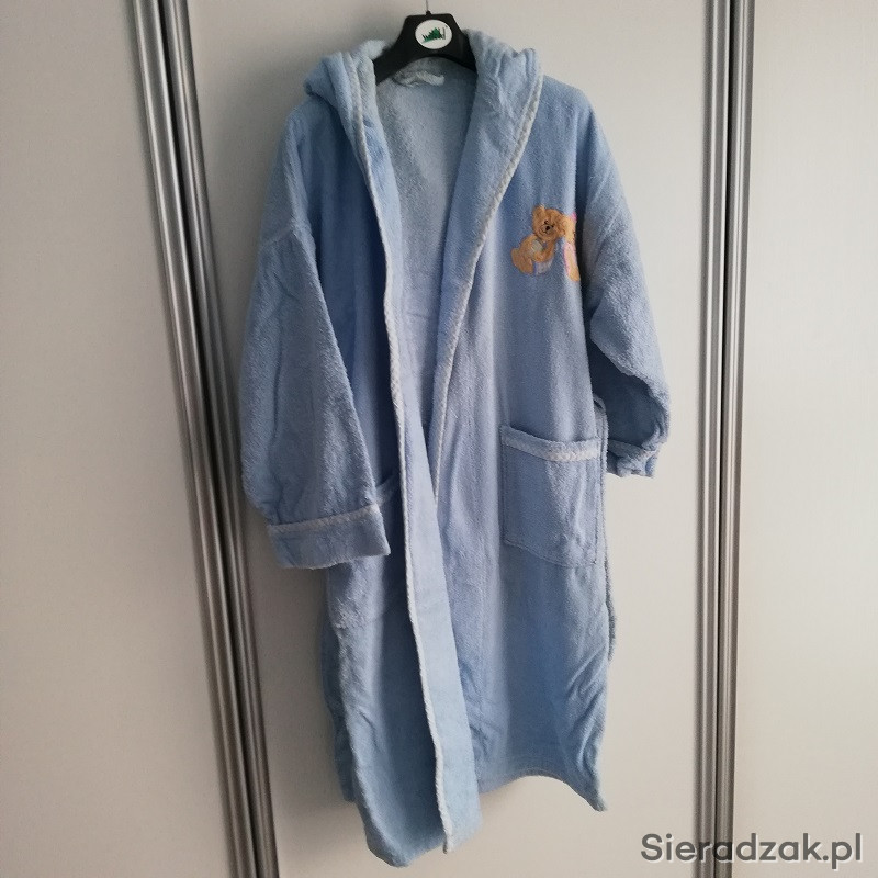 Szlafrok damski niebieski z kapturem wiązany na pasek, z dwoma kieszeniami.