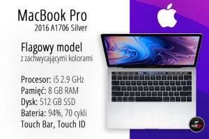 Do sprzedania oferujemy wyjątkowo zadbanego MacBook'a Pro 13 A1706 (2016) z dwurdzeniowym procesorem Intel i5 2x2.9 GHz (do 3.3 GHz TURBO), 8 GB RAM, dyskiem SSD 512 GB, zintegrowaną kartą graficzną Intel Iris Plus Graphics 550, 4xUSB-C (Thunderbolt 3), BLUETOOTH, paskiem TOUCHBAR z czytnikiem linii papilarnych Touch ID, ekranem RETINA w rozdzielczości 2560x1600, podświetlaną klawiaturą, kamerą FaceTime HD oraz mocną i niewyeksploatowaną baterią (tylko 70 cykli ładowania i 94% pojemności).