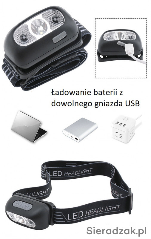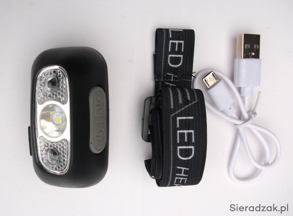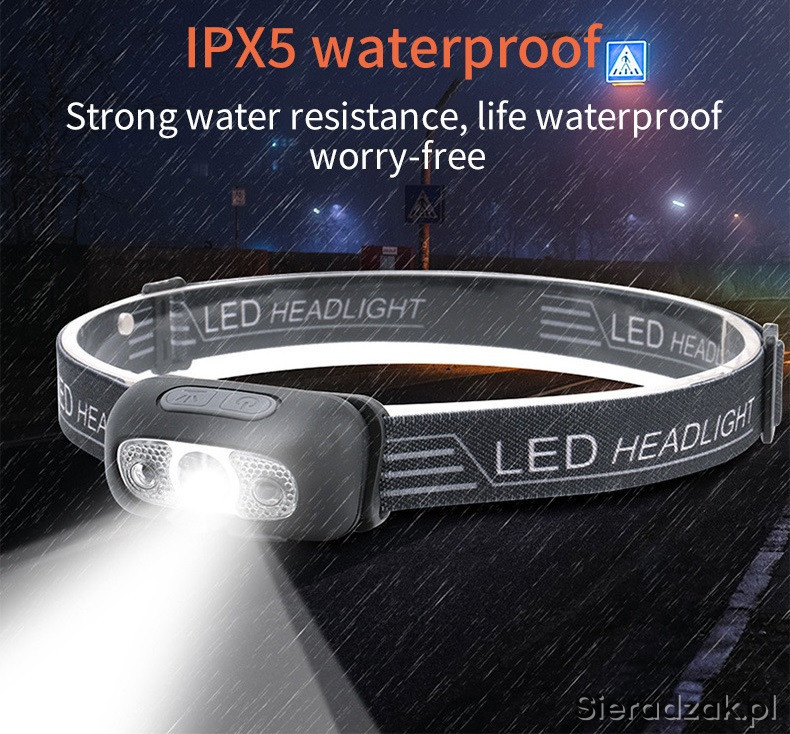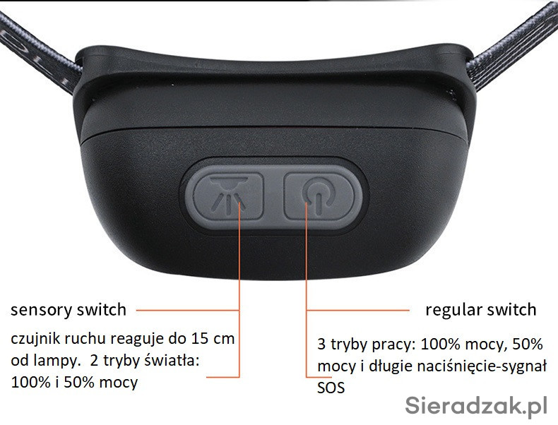 Latarka czołowa z dwoma przyciskami: standardowy włącznik i włącznik czujnika ruchu, który reaguje do 15 cm od lampy.