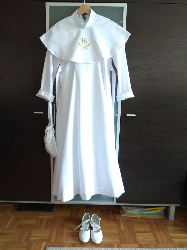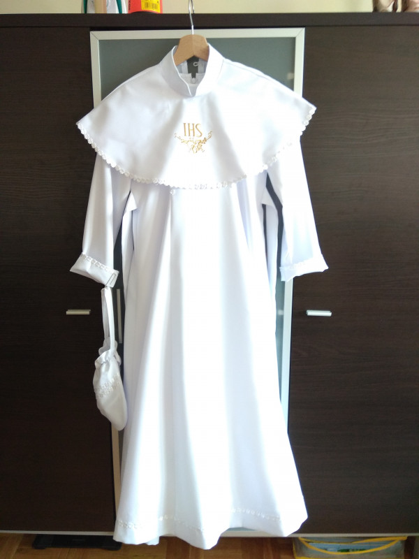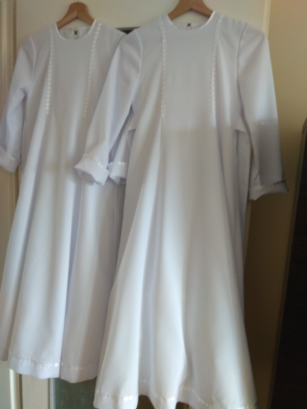 Dzień dobry mam do sprzedania do komunii 2 kpl Alb dla dziewczynek od biżniaczek.Ubranka w stanie bardzo dobrym odświeżone.Cena do małej negocjacji.