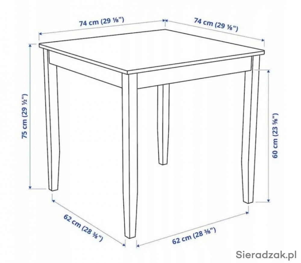 wymiary blatu 74x74 cm, wysokość 75 cm